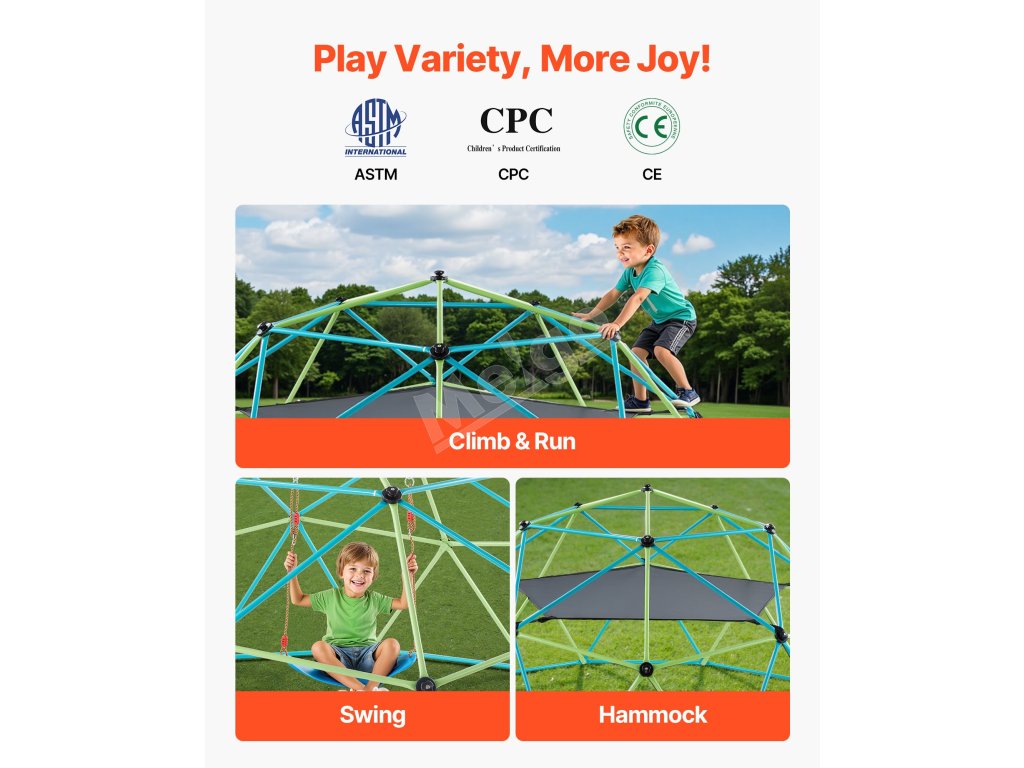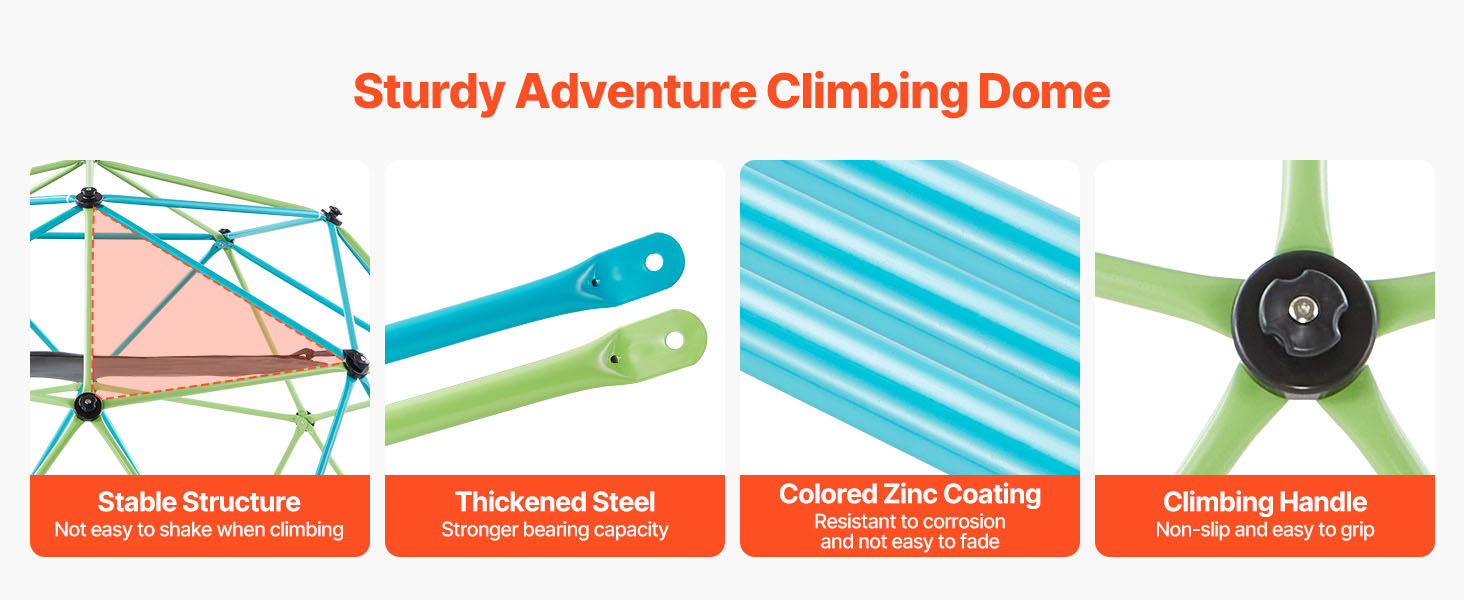 Vďaka tomu, že každé lezenie je bezpečné a zábavné, má naša detská kopulová preliezačka stabilnú trojuholníkovú konštrukciu, ktorá počas hry zostáva stabilná. Zhrubnuté oceľové rúrky zvyšujú nosnosť, farebný zinkový náter odoláva hrdzi a vyblednutiu a protišmykové rukoväte na lezenie ponúkajú bezpečné uchopenie.