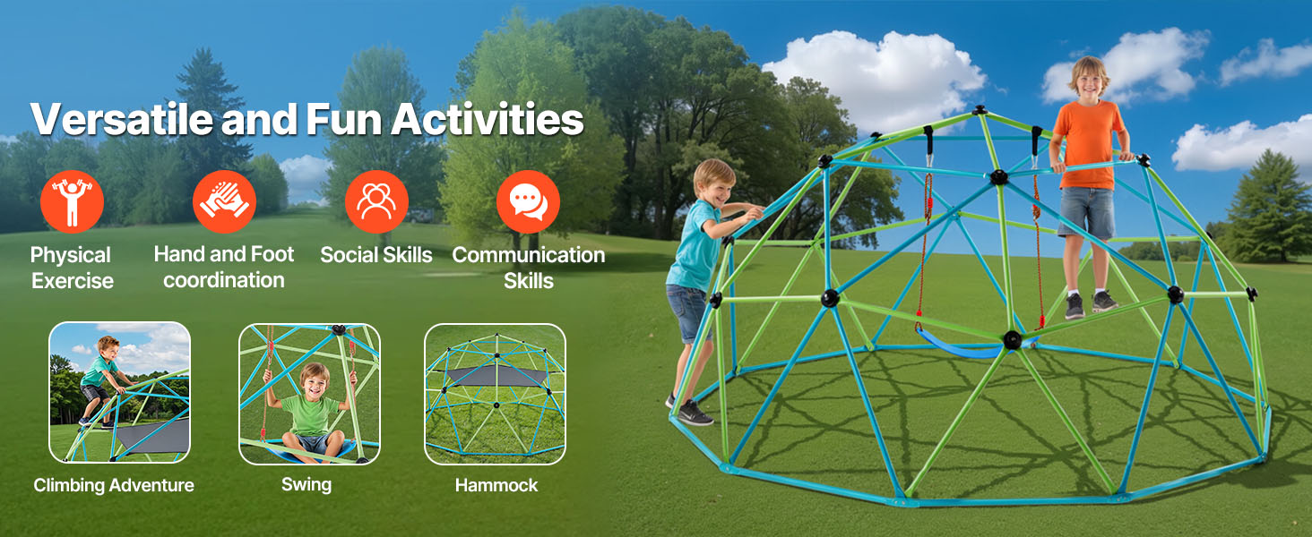 Nechajte deti liezť, hrať sa, skúmať a rásť s našou 10FT lezeckou kupolou. Vďaka stabilnej konštrukcii, zosilneným oceľovým rúrkam, protišmykovým držadlám, vysokej nosnosti 1000 libier, hojdačke a hojdacej sieti je ideálna na posilnenie fyzickej sily, koordinácie, komunikácie a sociálnych zručností.
