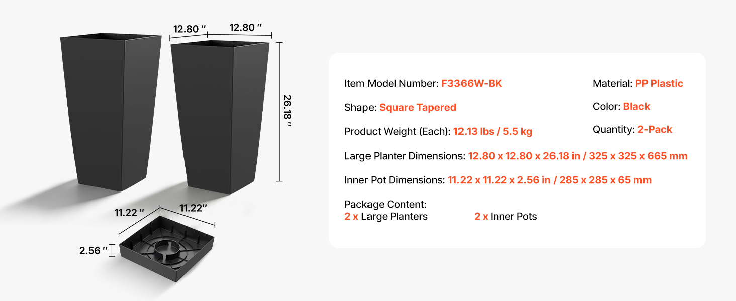 | Rozmery veľkého kvetináča | 12,80 x 12,80 x 26,18 palca / 325 x 325 x 665 mm |