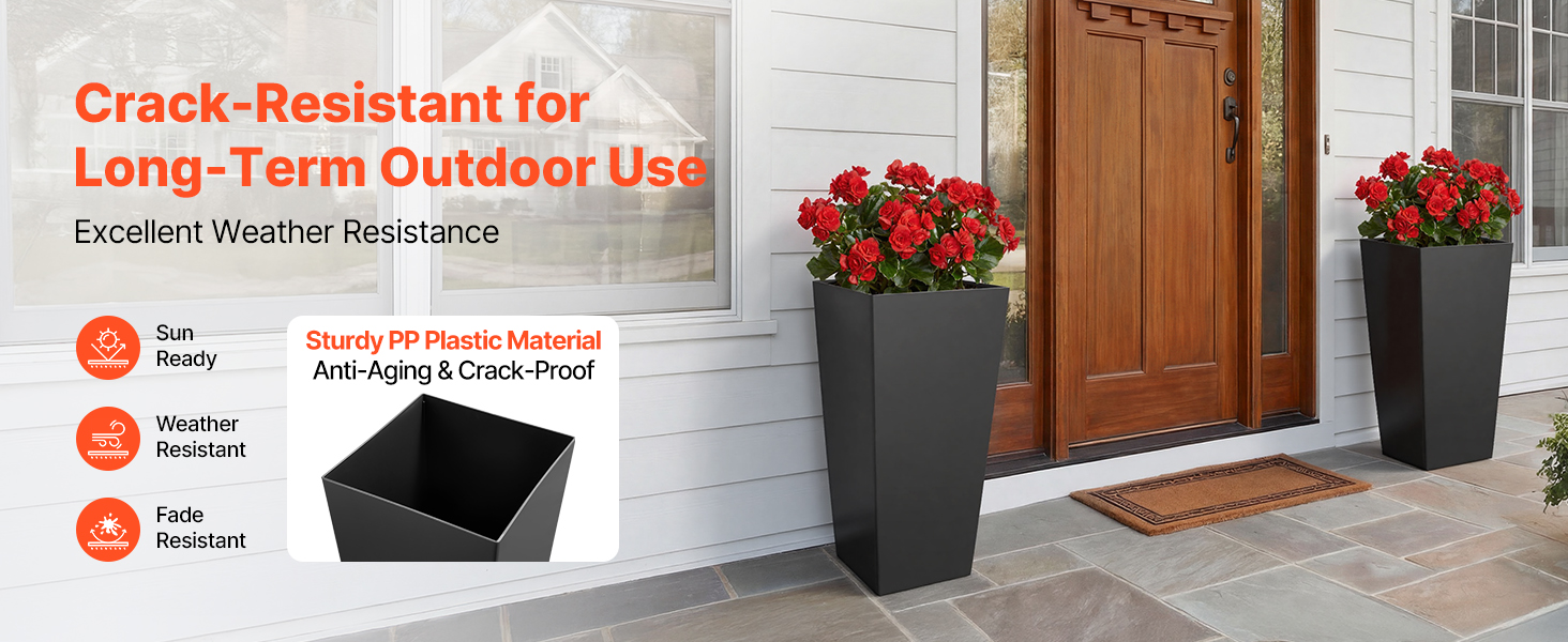 Tieto vysoké vonkajšie kvetináče sú vyrobené z odolného PP plastu a odolávajú opotrebeniu, vyblednutiu a praskaniu. Sú navrhnuté tak, aby odolali dažďu, slnku a každodennému používaniu, a zostávajú stabilné a v rovnej polohe, čím zaručujú dlhodobú životnosť vo vonkajšom prostredí.