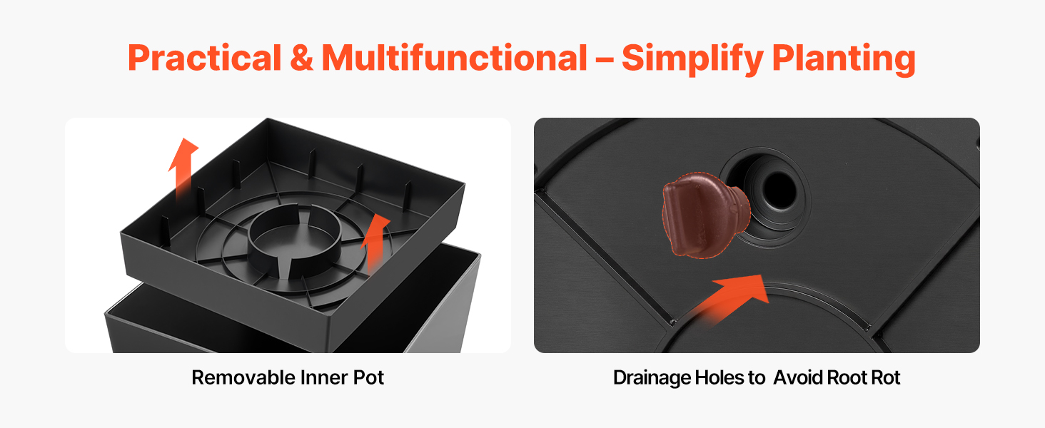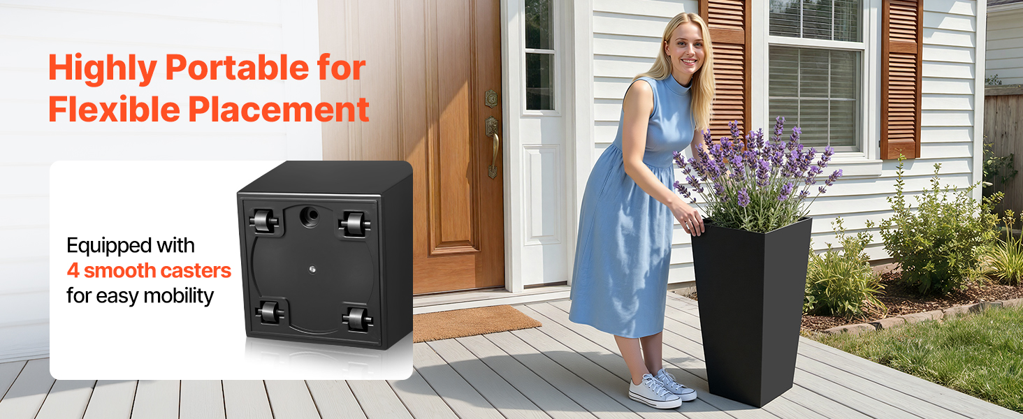 Vďaka hladko sa otáčajúcim kolieskam na spodnej strane môžete tieto vysoké kvetináče na prednú verandu posúvať horizontálne medzi jednotlivými miestami, a to aj v stiesnených alebo úzkych priestoroch.