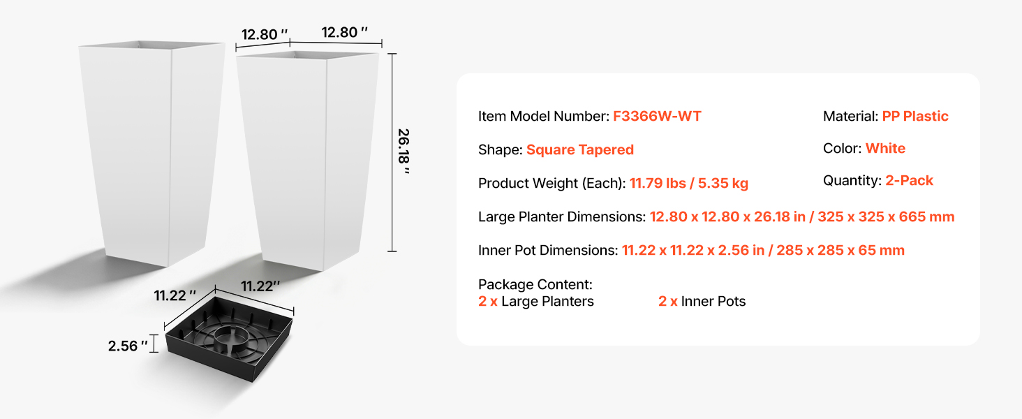 | Rozmery veľkého kvetináča | 12,80 x 12,80 x 26,18 palca / 325 x 325 x 665 mm |