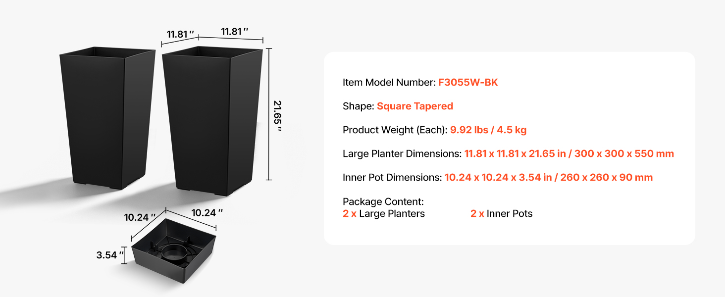 | Rozmery veľkého kvetináča | 11,81 x 11,81 x 21,65 palca / 300 x 300 x 550 mm |