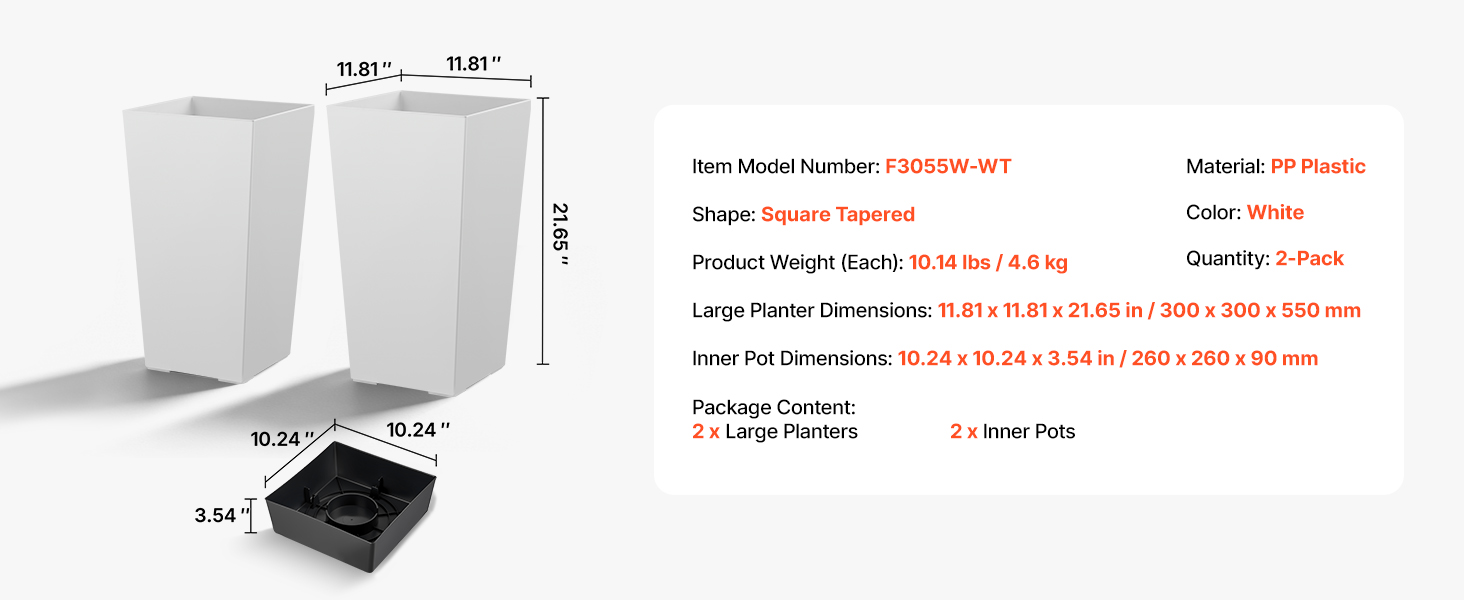 | Rozmery veľkého kvetináča | 11,81 x 11,81 x 21,65 palca / 300 x 300 x 550 mm |