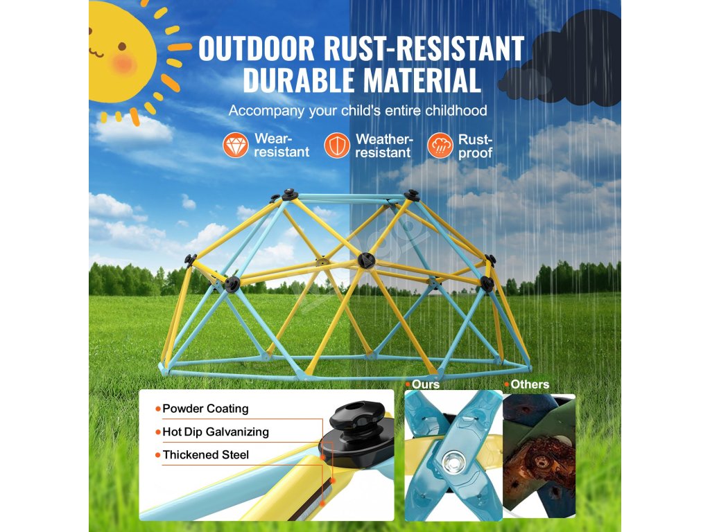 Naša vonkajšia lezecká kupola vyrobená zo zosilnenej ocele a ošetrená žiarovým zinkovaním a náterom poskytuje lepšiu ochranu proti UV žiareniu, hrdzi a korózii. Je ideálna na vonkajšie použitie a sprevádza vaše dieťa šťastným detstvom.
