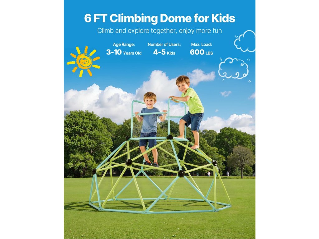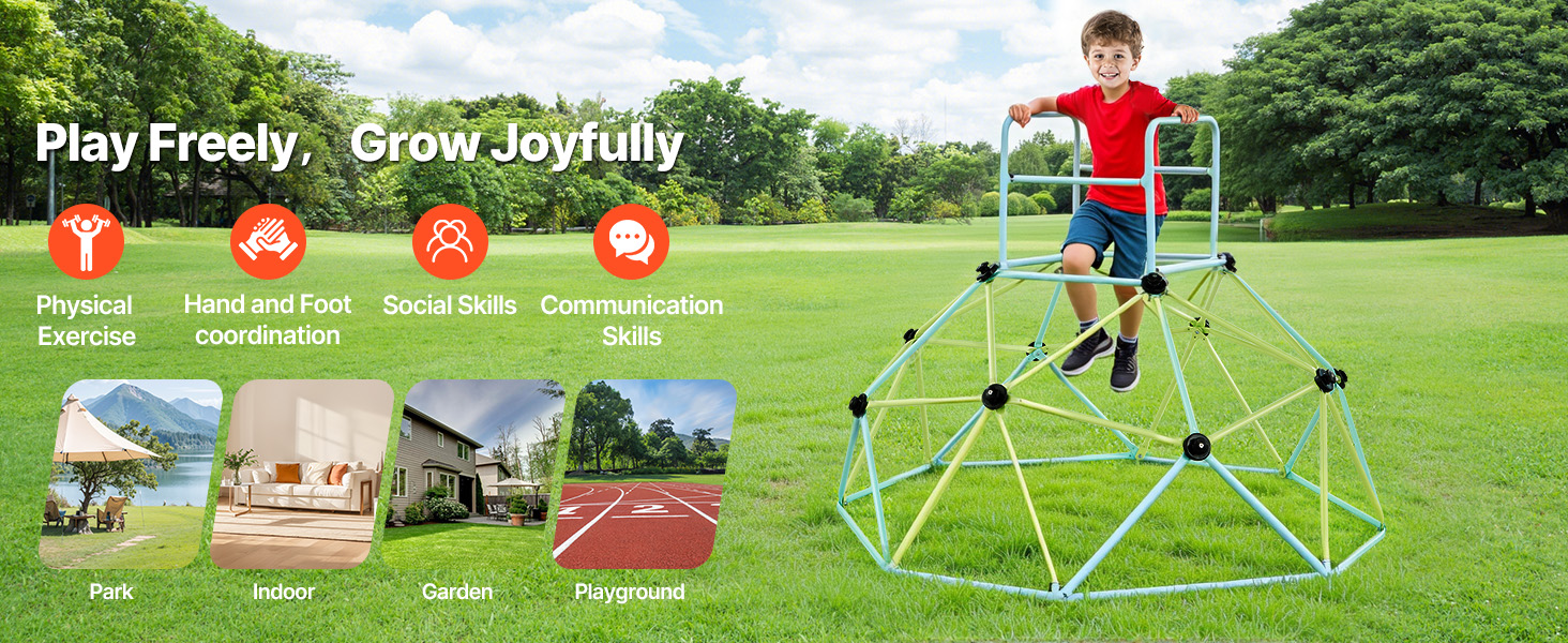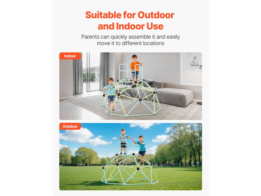 Táto 6FT široká lezecká kupola jungle gym pojme súčasne 4 až 5 detí, takže je obľúbeným ihriskom na víkendové párty alebo susedské stretnutia. Podporujte fyzické cvičenie, koordináciu a sociálnu interakciu!