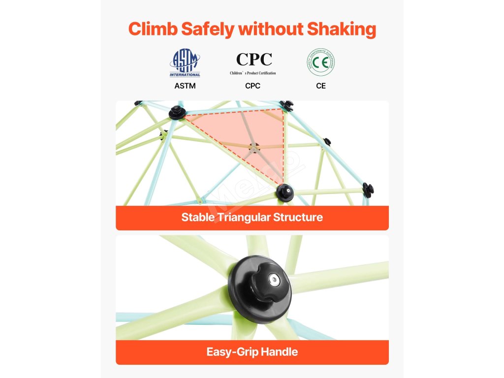 Vďaka tomu, že každé lezenie je bezpečné a zábavné, má naša detská kopulovitá preliezačka stabilnú trojuholníkovú konštrukciu, ktorá počas hry zostáva stabilná. Zhrubnuté oceľové rúrky zvyšujú nosnosť, farebný zinkový náter odoláva hrdzi a vyblednutiu a protišmykové rukoväte na lezenie ponúkajú bezpečné uchopenie.