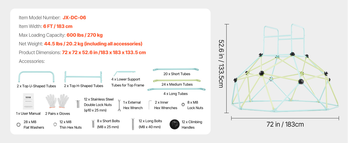 Nechajte svoje deti liezť, hrať sa, skúmať a rásť s touto 6FT lezeckou kupolou. Vďaka stabilnej konštrukcii, zosilneným oceľovým rúrkam, protišmykovým držadlám a vysokej nosnosti 600 libier je ideálna na posilnenie fyzickej sily, koordinácie, sociálnych a komunikačných zručností.