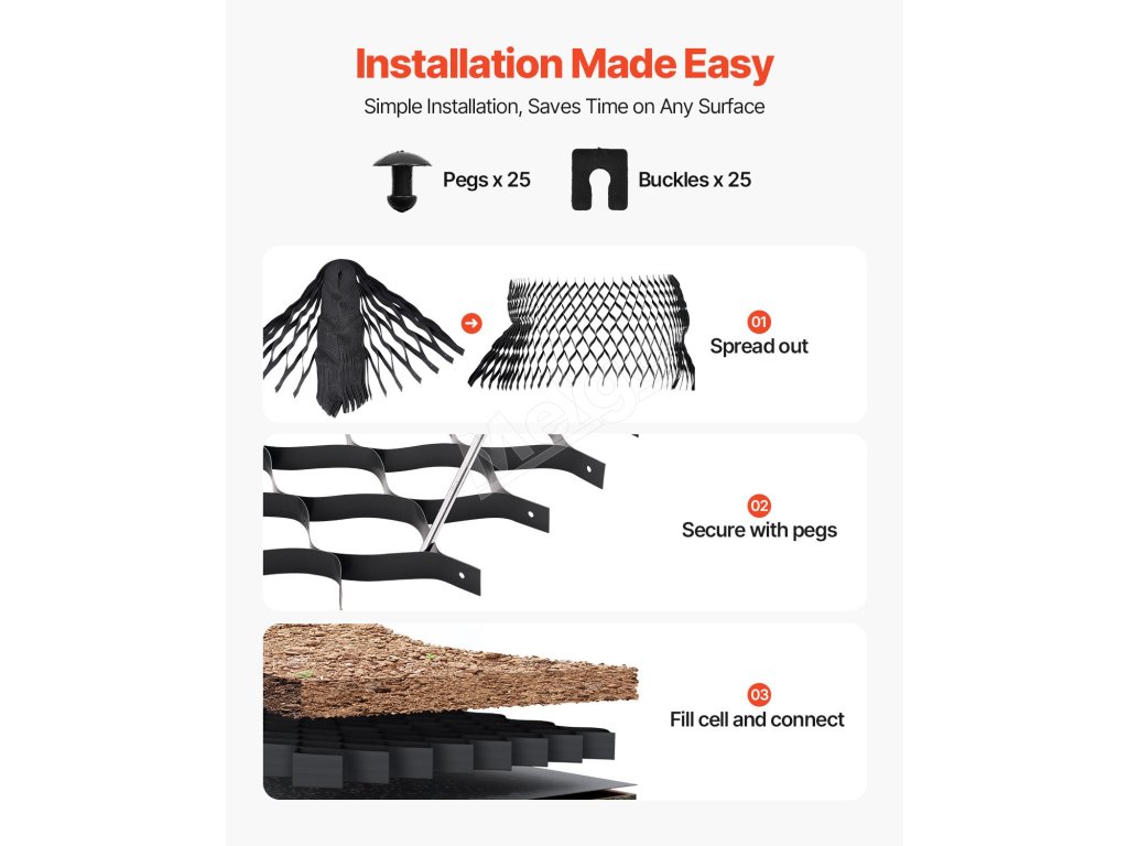 Odpoveď: Pri naplnení buniek je zaťaženie 1885 libier na štvorcový meter. Upozorňujeme, že pred inštaláciou mriežky musíte zabezpečiť rovný podklad, ale aj pevné upevnenie mriežky. >