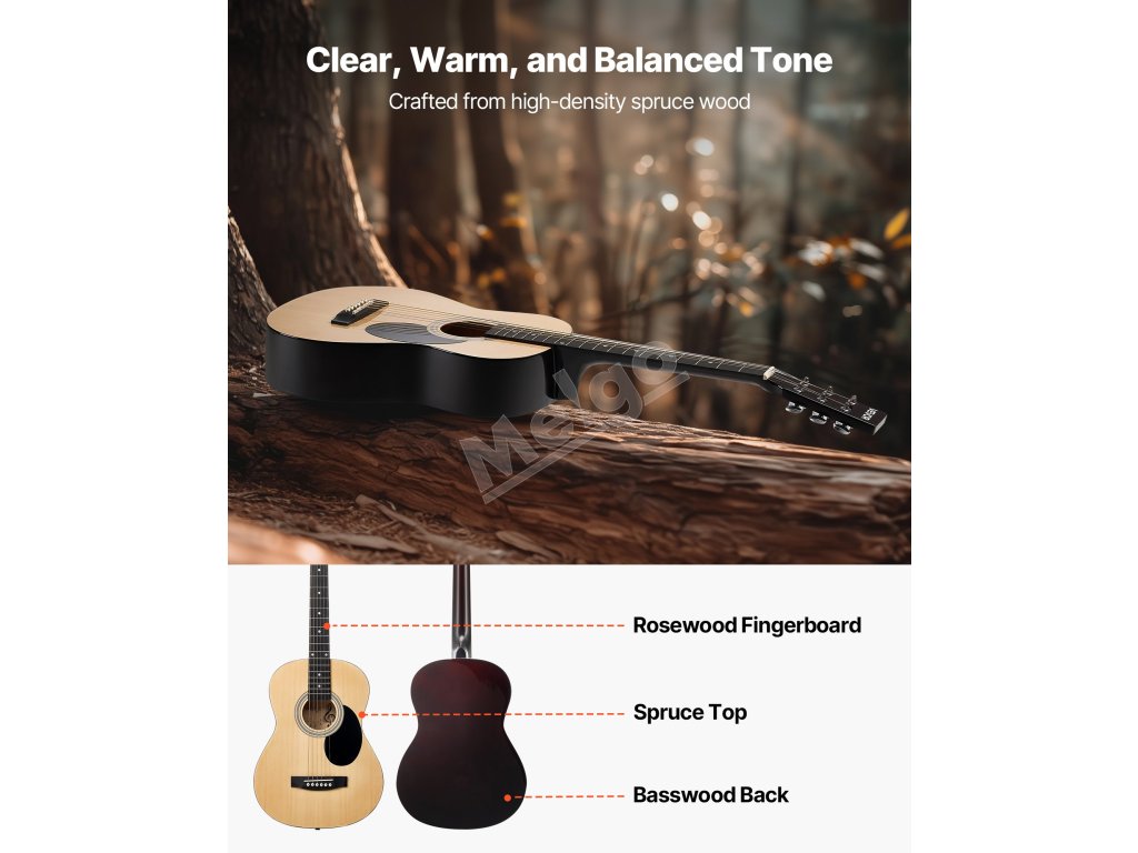 Táto akustická gitara má štandardnú veľkosť konštrukcie s vyváženým tónom a poskytuje pohodlné držanie pre bezproblémové hranie. Je ideálna pre začiatočníkov a cvičenie, zaručuje radostný a plynulý hudobný zážitok.
