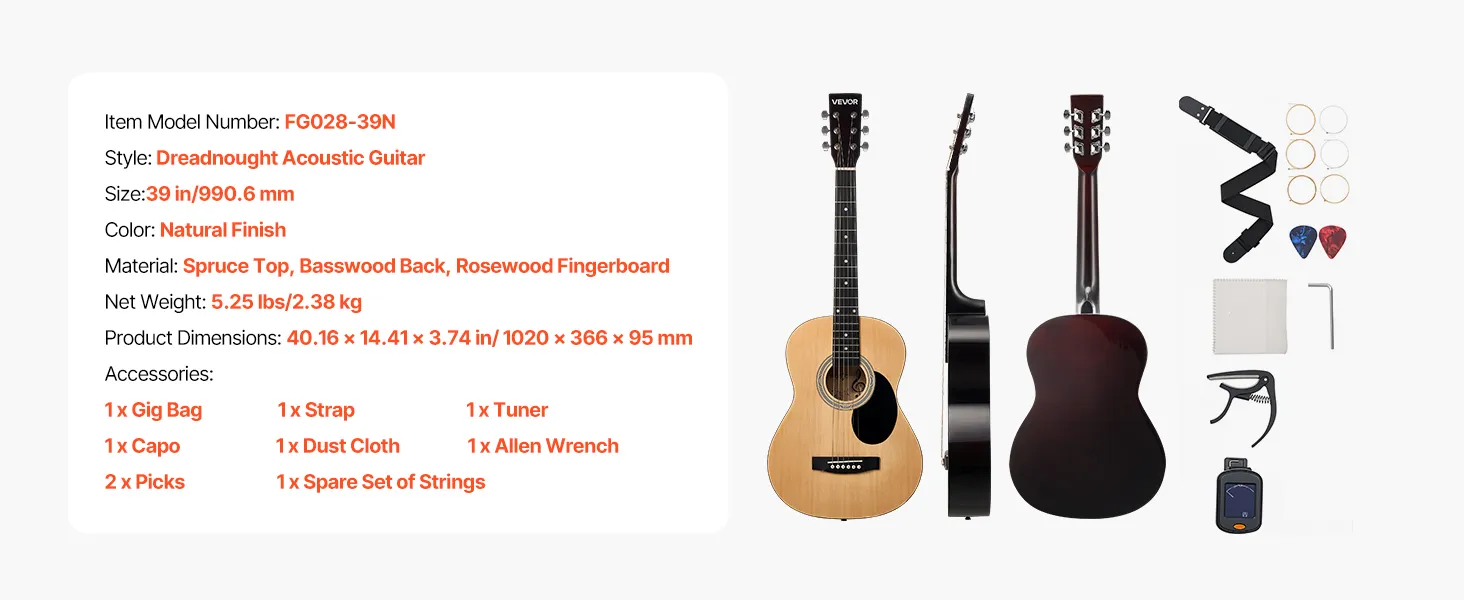 Naša akustická gitara so smrekovou vrchnou doskou a mahagónovým telom poskytuje teplý, plný tón, ktorý sa hodí pre akýkoľvek štýl. Veľkosť je vhodná pre väčšinu dospelých. Rýchlo sa ladí, dodáva sa s vodeodolným, odolným gig bagom Oxford a všetkým nevyhnutným príslušenstvom.