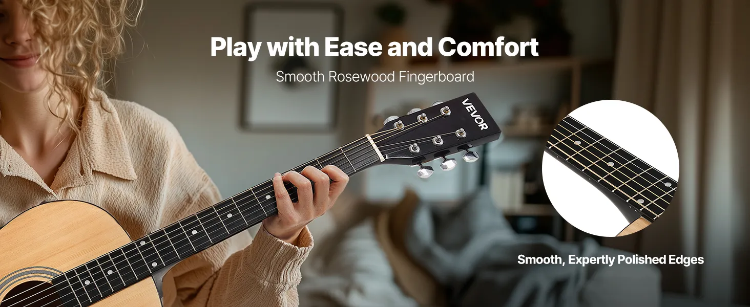 Naša akustická gitara je vybavená hladkým palisandrovým hmatníkom, ktorý vám poskytne pohodlný zážitok z hry a lepší pôžitok z nej.