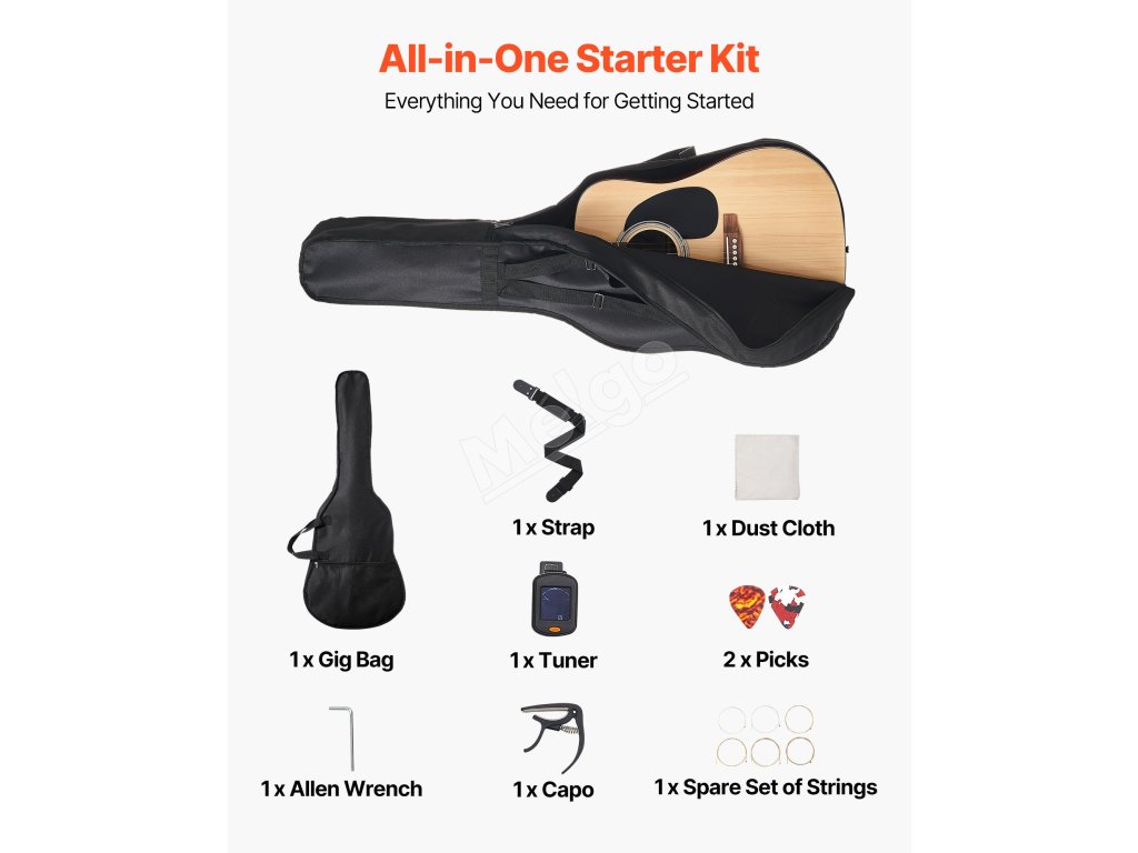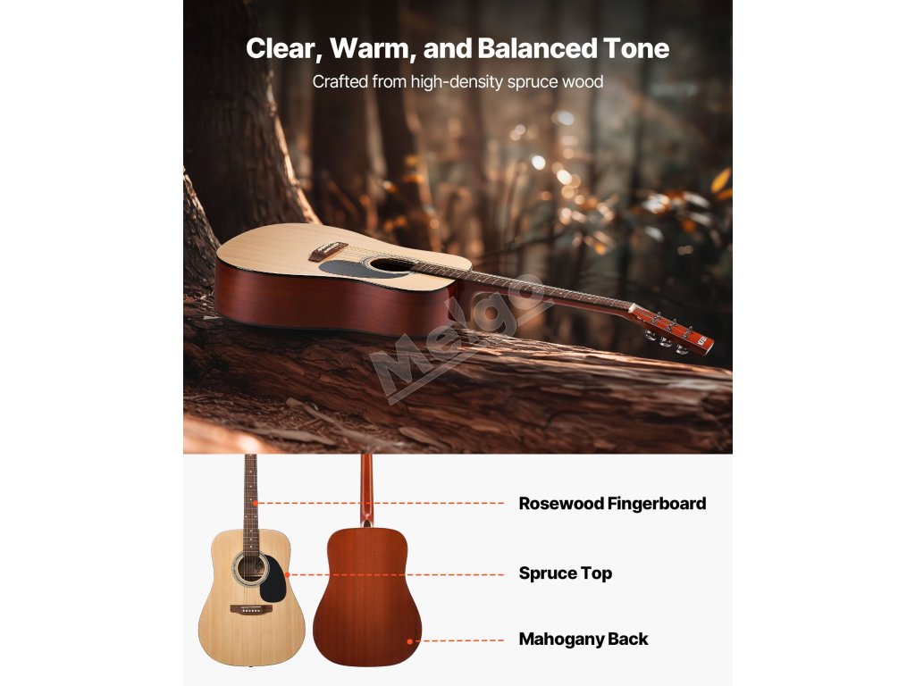 Naša akustická gitara so smrekovou vrchnou doskou a mahagónovým telom prináša teplý, plný tón, ktorý sa hodí pre akýkoľvek štýl. Veľkosť je vhodná pre vyšších hráčov s určitými skúsenosťami. Rýchlo sa ladí, dodáva sa s vodeodolným, odolným gig bagom Oxford a všetkým nevyhnutným príslušenstvom.