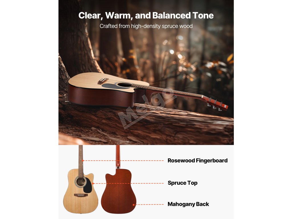 Naša akustická gitara je vybavená hladkým palisandrovým hmatníkom, ktorý vám poskytne pohodlný zážitok z hry a lepší pôžitok z nej.