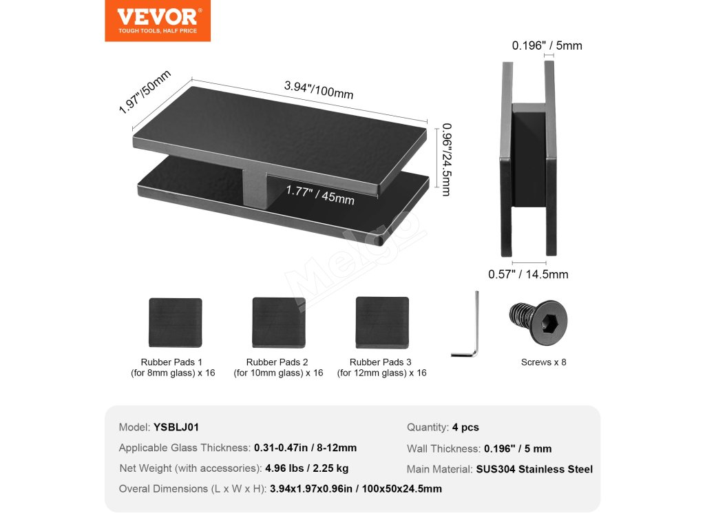 Sklenené svorky 4 ks obdĺžnikové nerez 304 pre sklo 0.31"-0.47" hr. 0.2"