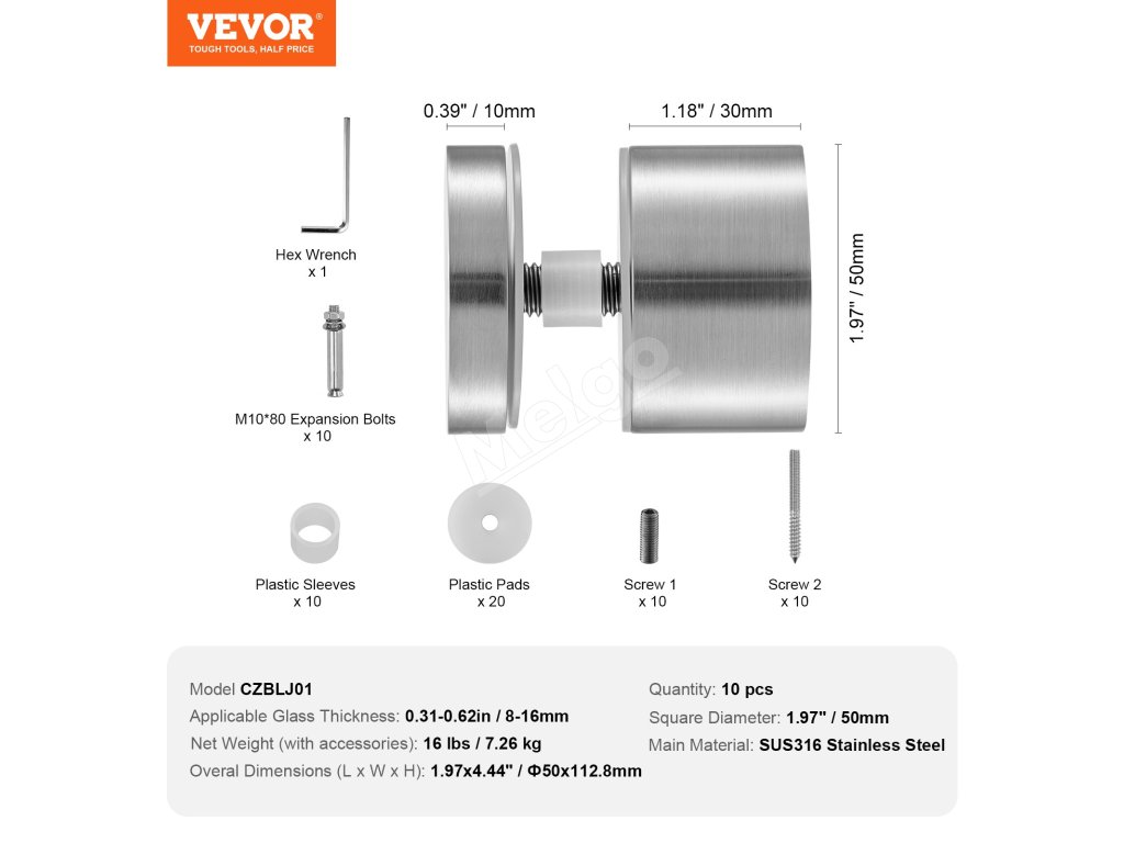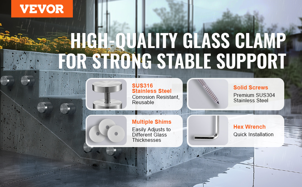 Naša svorka na sklo je vyrobená z prvotriednej nehrdzavejúcej ocele, odolná voči korózii a vhodná do všetkých poveternostných podmienok. Možno ju opakovane používať a ľahko sa prispôsobí rôznym hrúbkam skla.