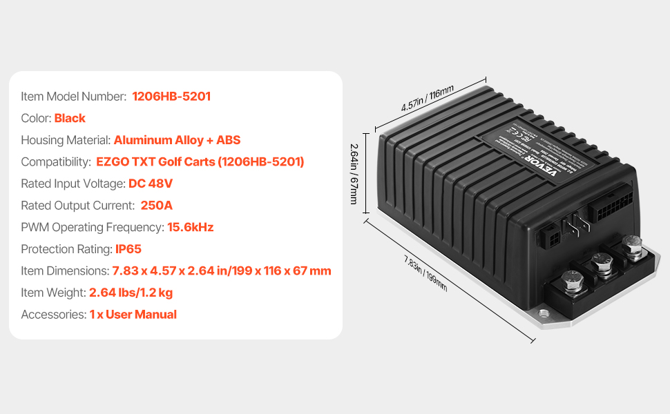 Náš regulátor otáčok golfového vozíka je vhodný pre modely EZGO TXT 1206HB-5201 a umožňuje jednoduché zapojenie a používanie. Vďaka 48V vstupu a 250A výstupu, vodotesnosti IP65 a krytu z hliníkovej zliatiny a ABS vám zaručí pokojnú jazdu. Rýchly štart a vysokofrekvenčná odozva 15,6 kHz zvyšujú účinnosť a výkon.