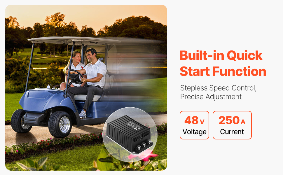 Tento regulátor motora golfového vozíka je vybavený rýchlym štartom pre okamžitú odozvu plynu a bezproblémovú akceleráciu. So vstupom 48 V a výstupom 250 A zabezpečuje plynulú, efektívnu jazdu a presné riadenie rýchlosti.