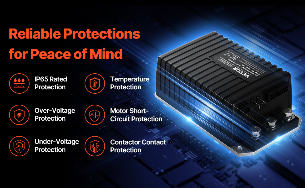 Regulátor golfového vozíka má viacero bezpečnostných funkcií na zachovanie stabilnej prevádzky aj v nepriaznivom počasí. Je navrhnutý tak, aby zabezpečil váš golfový vozík počas každej jazdy pre spoľahlivosť.