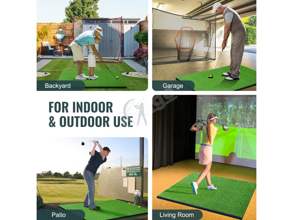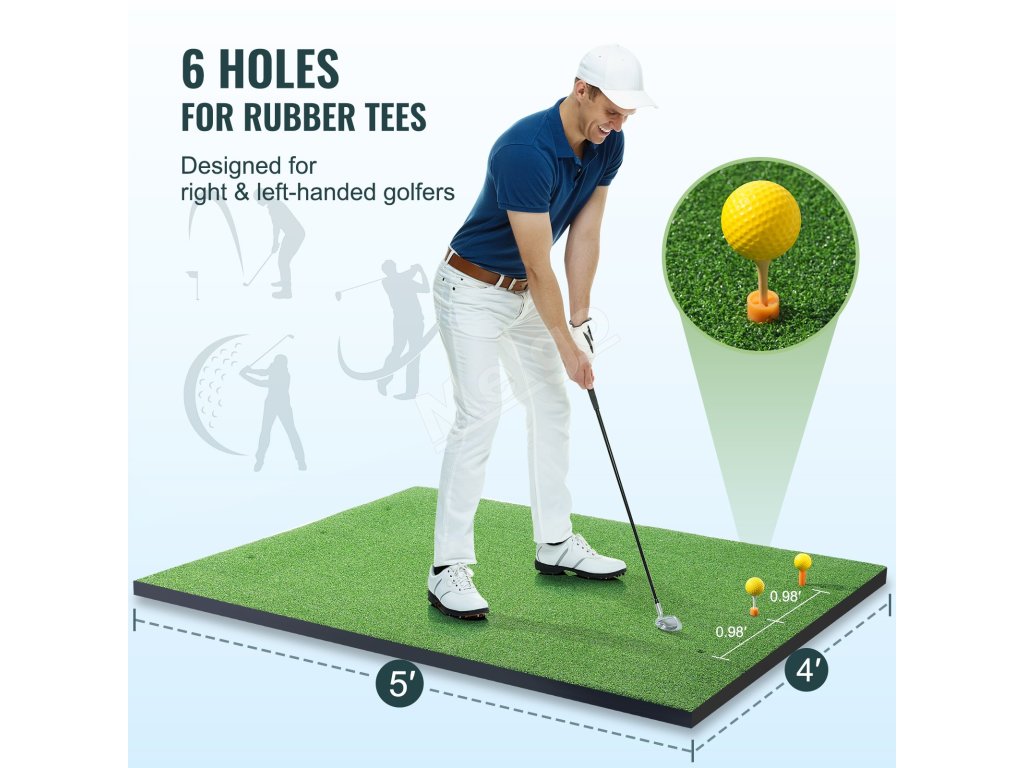Táto vonkajšia golfová rohož je univerzálna, prispôsobená pravákom aj ľavákom, so šiestimi otvormi na gumené odpaliská. Môžete ju používať v rôznych smeroch, aby ste zabránili mäkkému kolapsu pri príliš dlhom státí na jednom mieste.