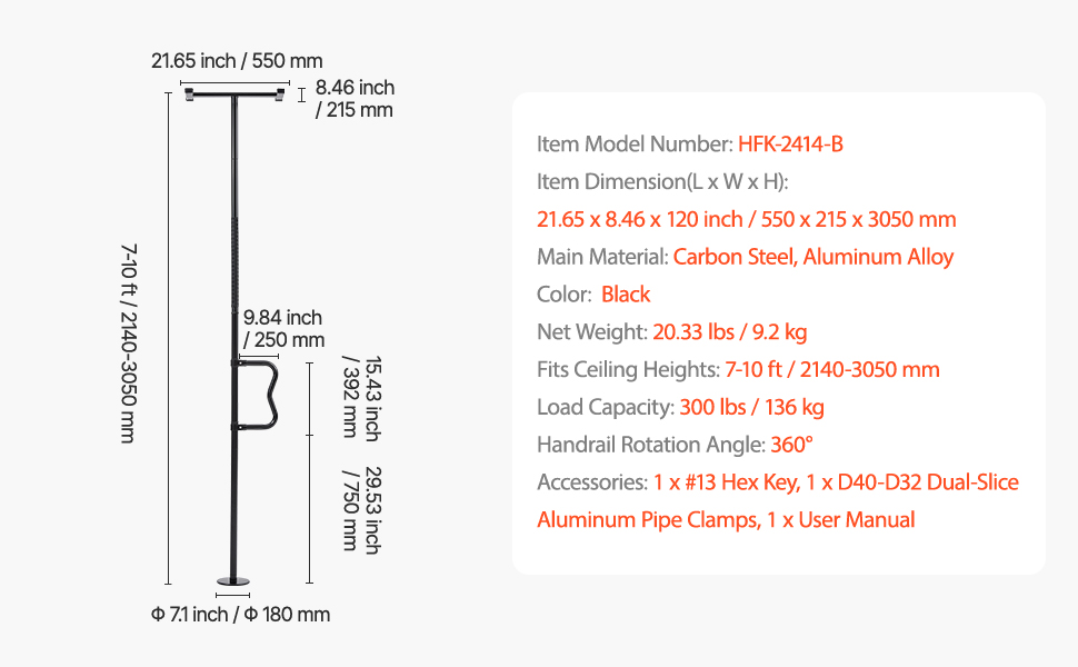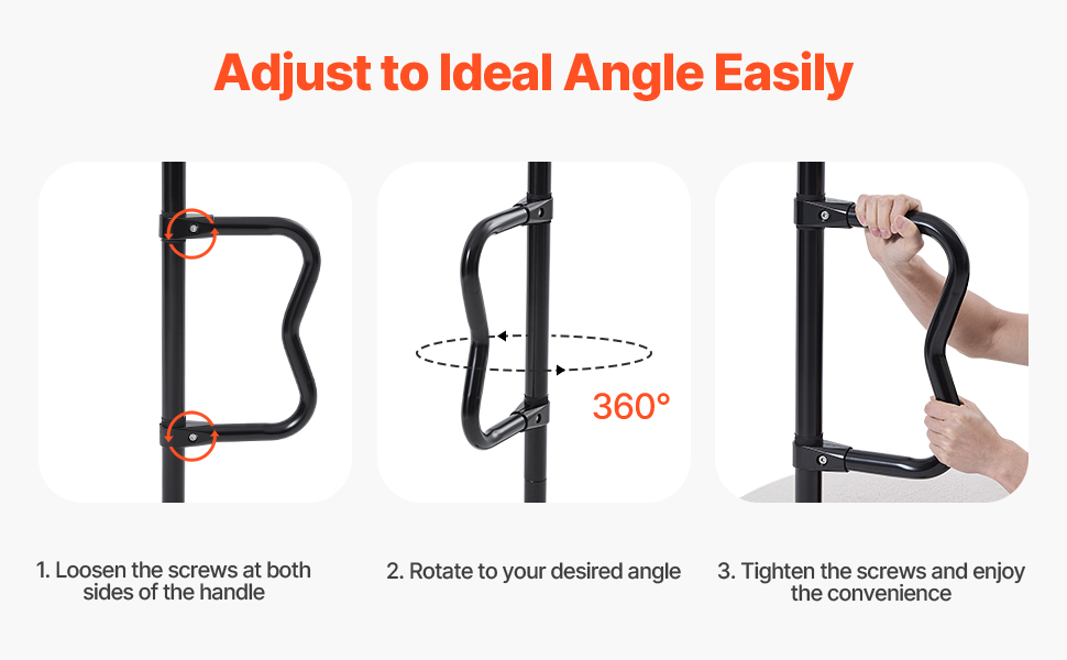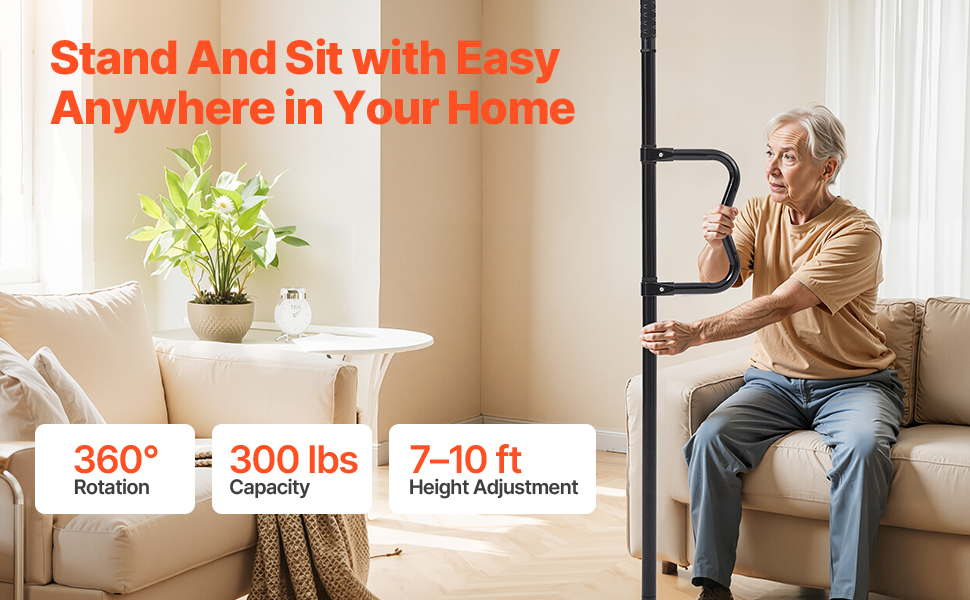 Naše madlo od podlahy k stropu má robustnú nosnosť 300 kg, čo zaručuje použitie v spálni, kúpeľni, na toalete atď. Vďaka nastaviteľnej výške 7-10 stôp sa nemusíte obávať výšky stropu. Otáča sa o 360° s intervalmi uzamknutia 45°, pričom nastavením skrutiek ponúka ideálny uhol opory.