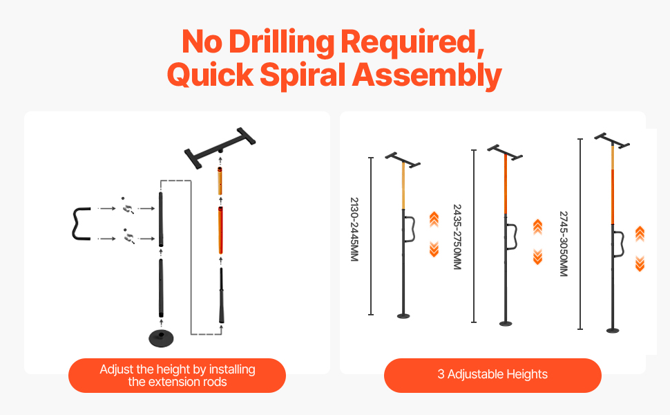 Naša prenosná tyč sa dodáva s kompletnou sadou montážneho príslušenstva. Jednoduchá montáž s otáčaním skrutiek umožňuje inštaláciu bez vŕtania. Môžete si vybrať montáž s predlžovacou tyčou A alebo predlžovacou tyčou B na základe výšky od stropu po podlahu, čím zabezpečíte ideálne prispôsobenie vášmu priestoru.