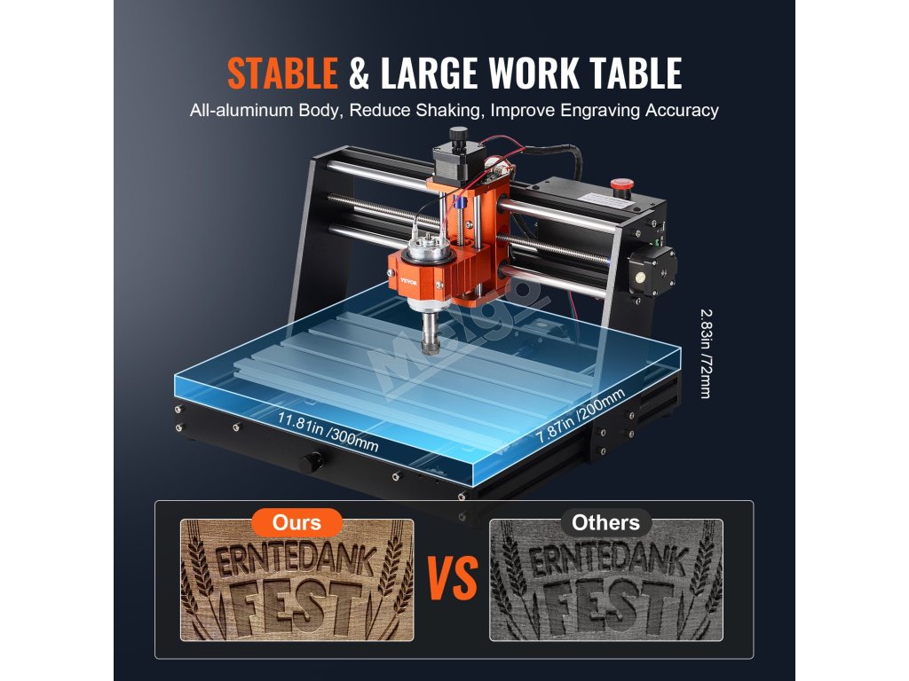 Náš CNC gravírovací stroj sa môže pochváliť pracovnou plochou s rozmermi 11,81 x 7,87 x 2,83 palca (300 x 200 x 72 mm). Vďaka telu z hliníkovej zliatiny, nadprúdovej ochrane a testovaniu podľa noriem CE bez námahy reže, vŕta a gravíruje rôzne materiály.