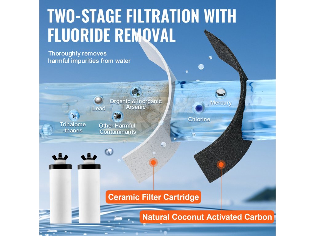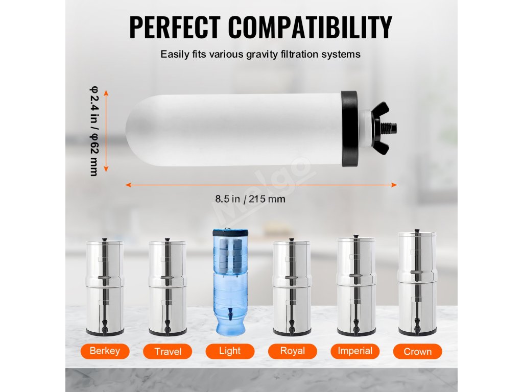 Náš gravitačný vodný filter sa dá ľahko nainštalovať bez použitia akéhokoľvek náradia. Stačí odskrutkovať maticu a nainštalovať filtre do gravitačného systému vodného filtra. Tesne priliehajúce matice zabezpečujú, že nedôjde k úniku, vďaka čomu je výrobok dokonale kompatibilný s rôznymi systémami gravitačnej filtrácie vody.