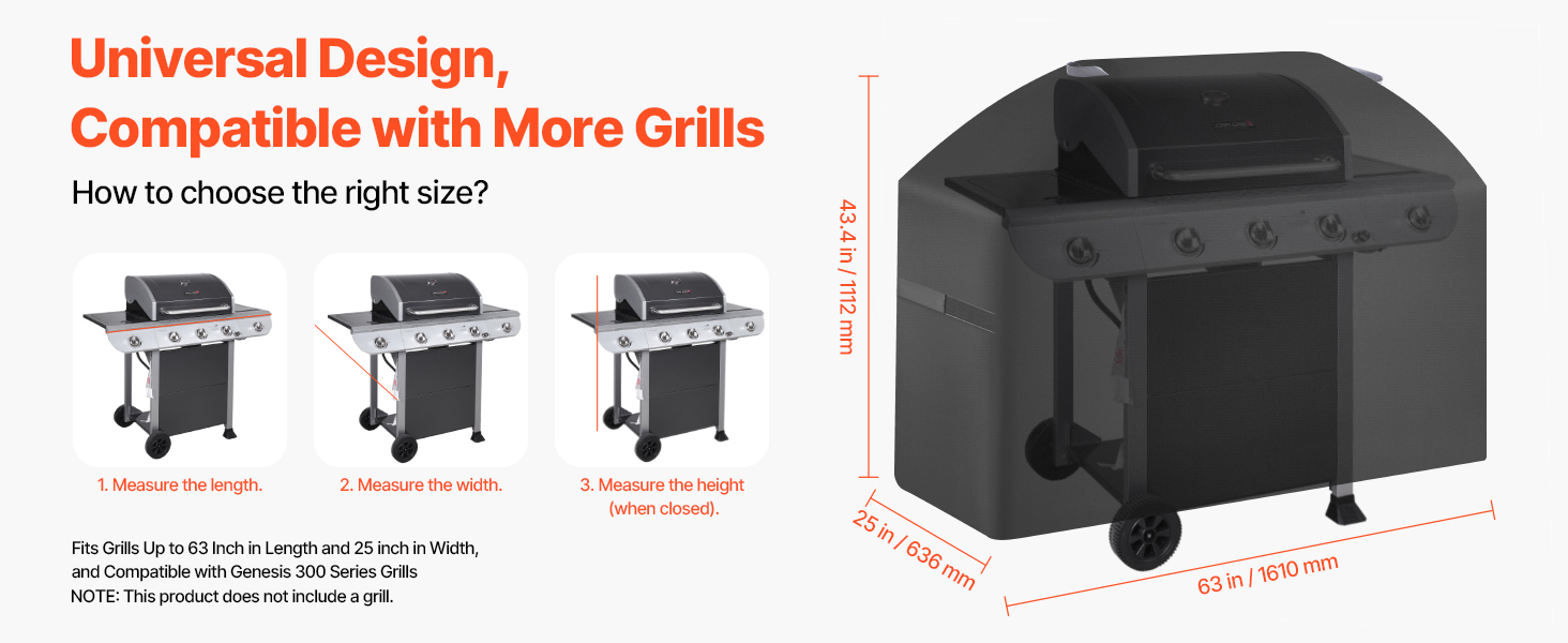 | Uplatniteľné výrobky | Hodí sa na kryty s dĺžkou do 63 palcov a šírkou do 25 palcov, kompatibilné s grilmi série Genesis 300. |
