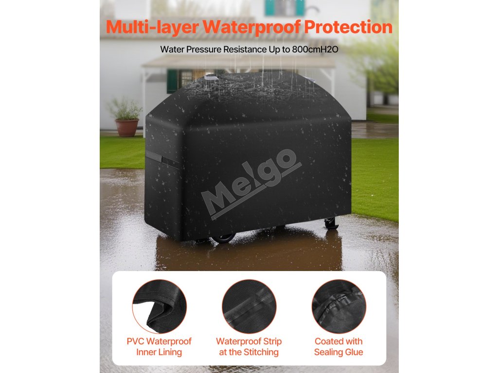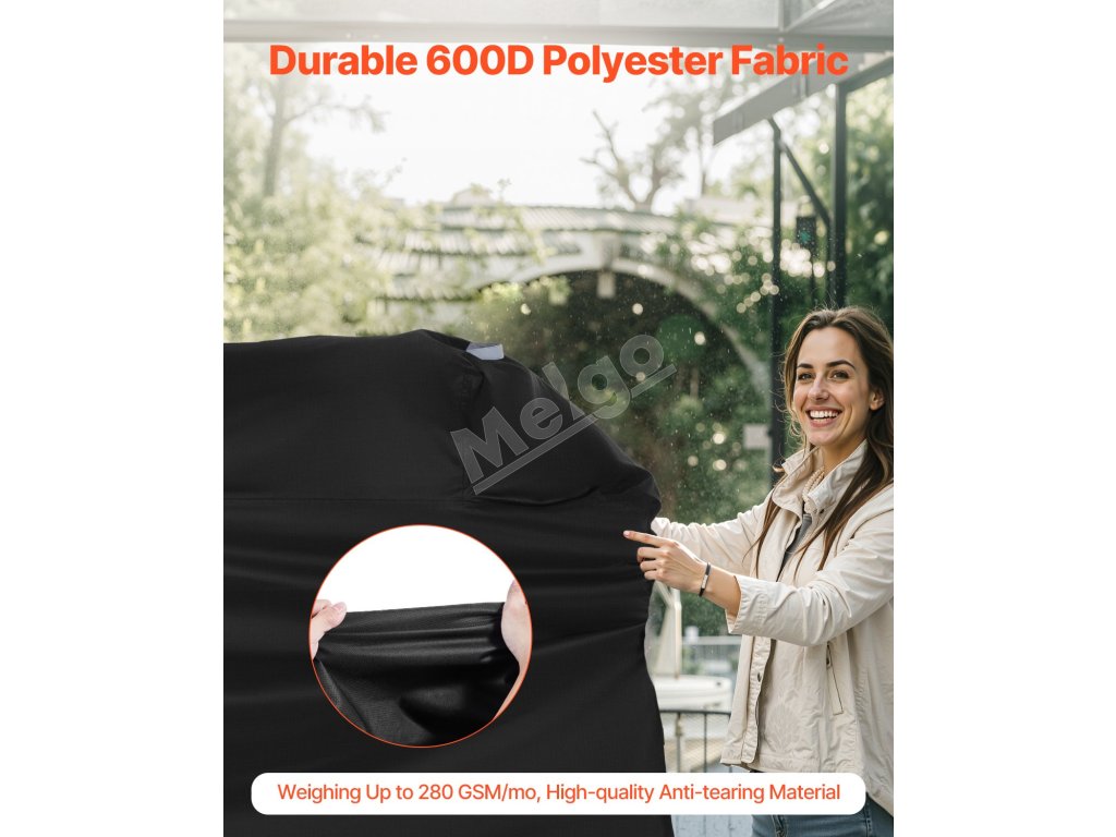 Vyrobený z 3 vrstiev vysokokvalitných materiálov: Vrstva z PVC, vrstva z polyesterových vlákien a vodotesná vrstva. Tento kryt na gril poskytuje odolnosť voči vode. Štyri rohy sú zosilnené, aby odolali opotrebovaniu. Šitie je úzko tkané, aby sa zvýšila vodotesnosť.