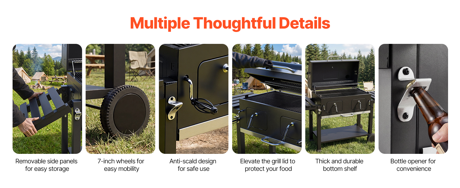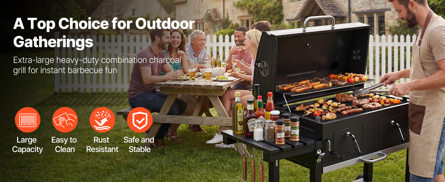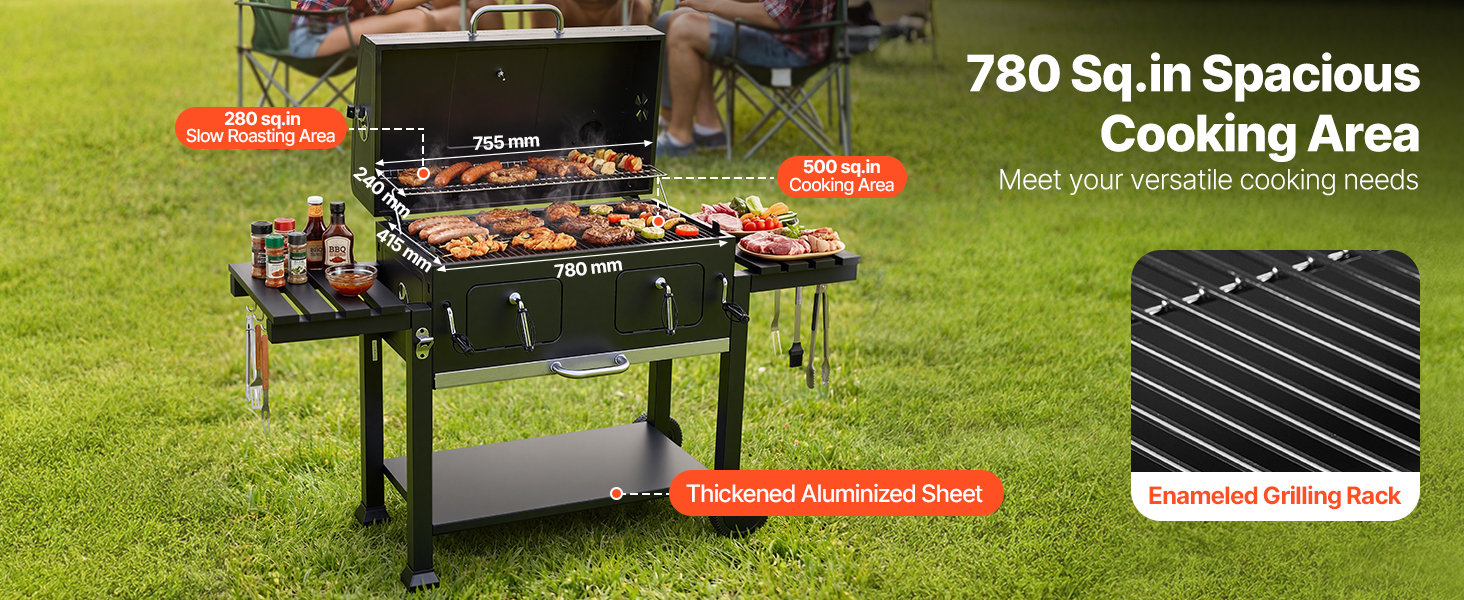 Tento gril na drevené uhlie kombinuje veľkú varnú plochu s rozlohou 780 štvorcových palcov, zdvíhateľné zásobníky na uhlie, odolnú oceľovú konštrukciu a viacero premyslených dizajnových prvkov, vďaka čomu ponúka efektívnejšie grilovanie na drevenom uhlí a lahodnú chuť grilovaných jedál pre rodinné posedenia.
