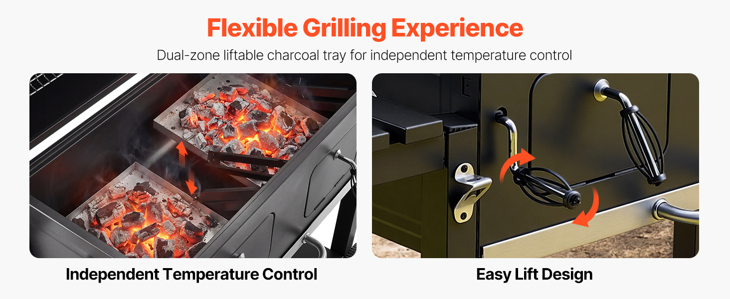 Dvojzónové zdvíhateľné zásobníky na uhlie umožňujú nezávislé nastavenie výšky, čo uľahčuje reguláciu rôznych úrovní tepla pre priame grilovanie pri vysokej teplote a pomalé varenie pri nízkej teplote zároveň.