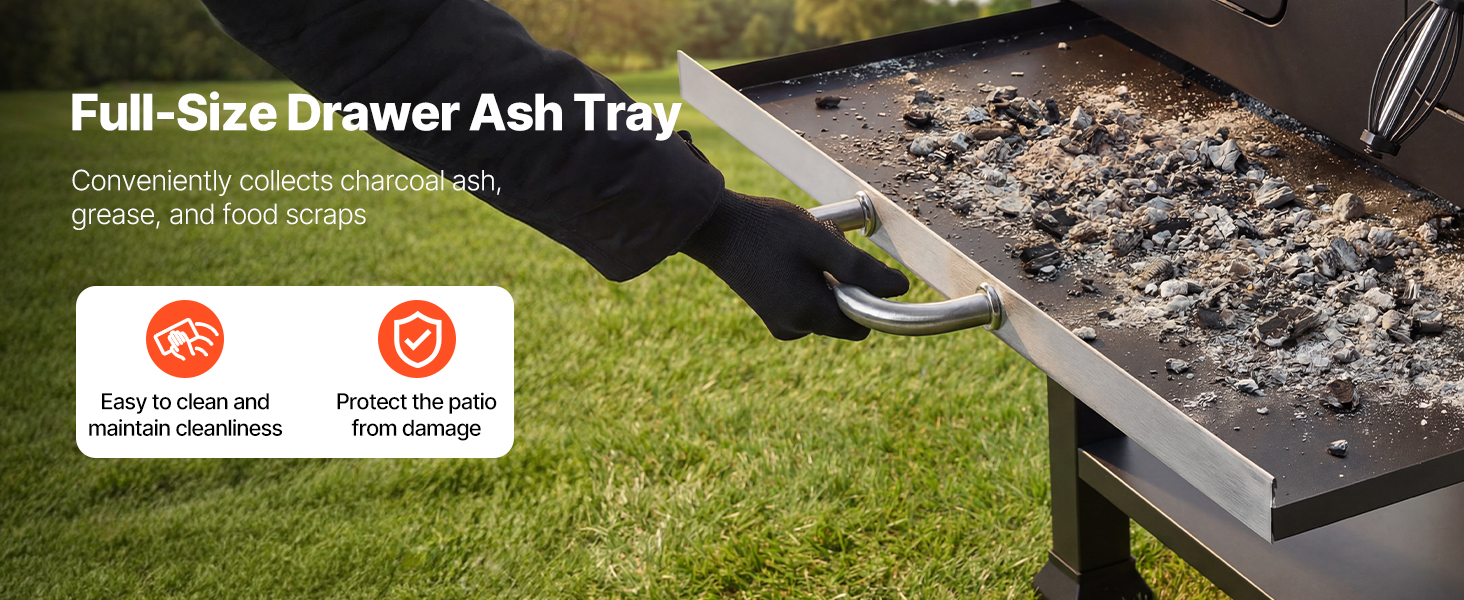 Veľká zásuvka na popol pohodlne zachytáva popol z uhlia, tuk a zvyšky jedla, čím sa znižuje neporiadok a čistenie je rýchle a jednoduché.