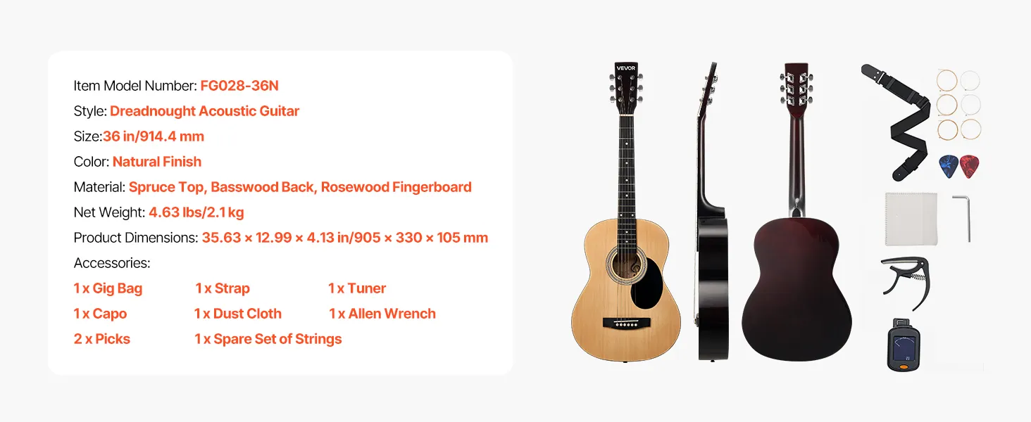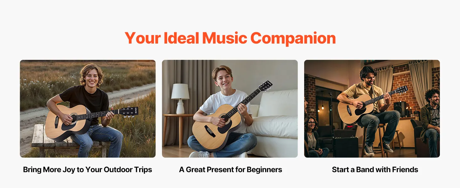 Táto akustická gitara má štandardnú veľkosť konštrukcie s vyváženým tónom a poskytuje pohodlné držanie pre bezproblémové hranie. Je ideálna pre začiatočníkov a cvičenie, zaručuje radostný a plynulý hudobný zážitok.