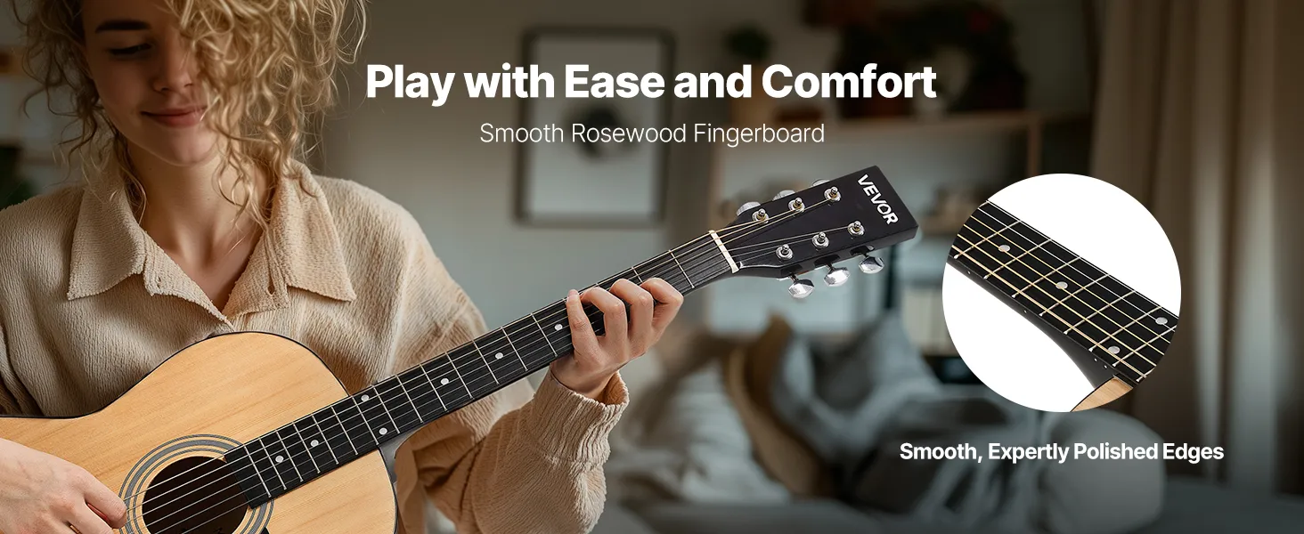 Naša akustická gitara je vybavená hladkým palisandrovým hmatníkom, ktorý vám poskytne pohodlný zážitok z hry a lepší pôžitok z nej.