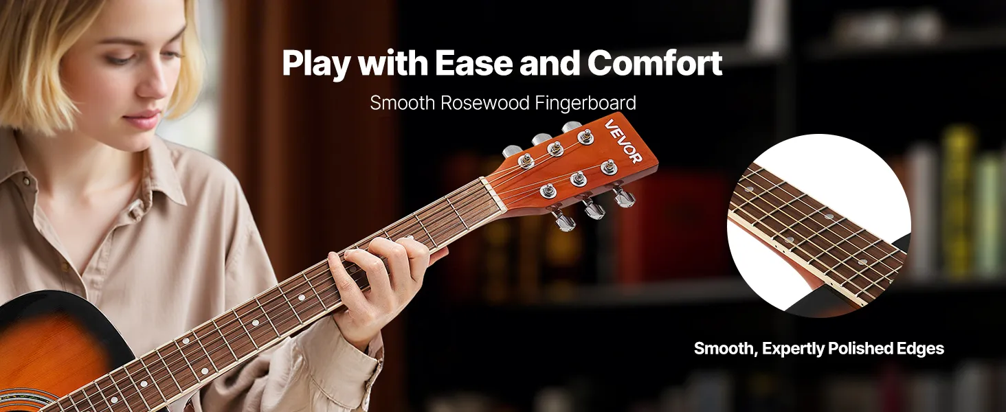 Naša akustická gitara je vybavená hladkým palisandrovým hmatníkom, ktorý vám poskytne pohodlný zážitok z hry a lepší pôžitok z nej.