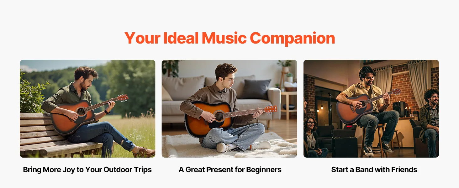 Táto akustická gitara má štandardnú veľkosť konštrukcie s vyváženým tónom a poskytuje pohodlný úchop na hranie bez námahy. Je ideálna pre začiatočníkov a cvičenie, zaručuje radostný a plynulý hudobný zážitok.