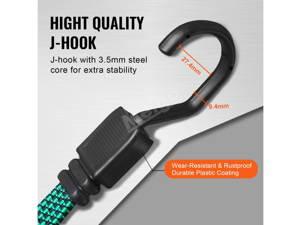 Vysokopevnostné háčiky na týchto súpravách bungee šnúr, ktoré sú navrhnuté na bezpečnú prepravu a skladovanie, odolávajú deformácii a zlomeniu a poskytujú dodatočnú bezpečnosť tým, že chránia predmety pred nárazmi a otrasmi.