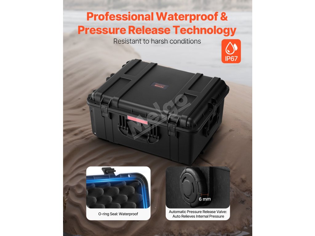 Tento vodotesný pevný kufor vybavený automatickým zariadením na uvoľnenie tlaku udržiava rovnováhu vnútorného a vonkajšieho tlaku, čím zabraňuje poškodeniu spôsobenému zmenami tlaku vzduchu počas cestovania.