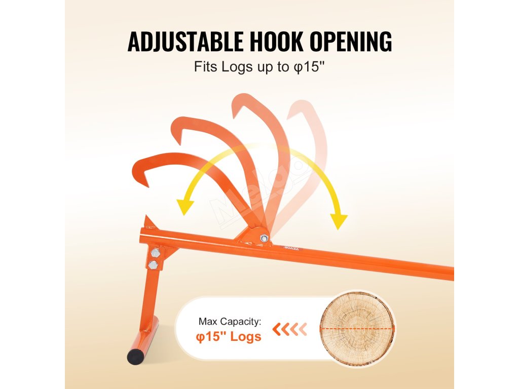 Vďaka 48" dlhej rukoväti využíva zdvihák na polená princíp páky, ktorý pomáha ľahko zdvíhať polená na rezanie. Otvor železného háku zdviháka na polená sa dá nastaviť, pričom sa dá použiť maximálne na okrúhle polená φ15''. Môžete ho používať s motorovou pílou, štiepačkou dreva na rezanie dreva.