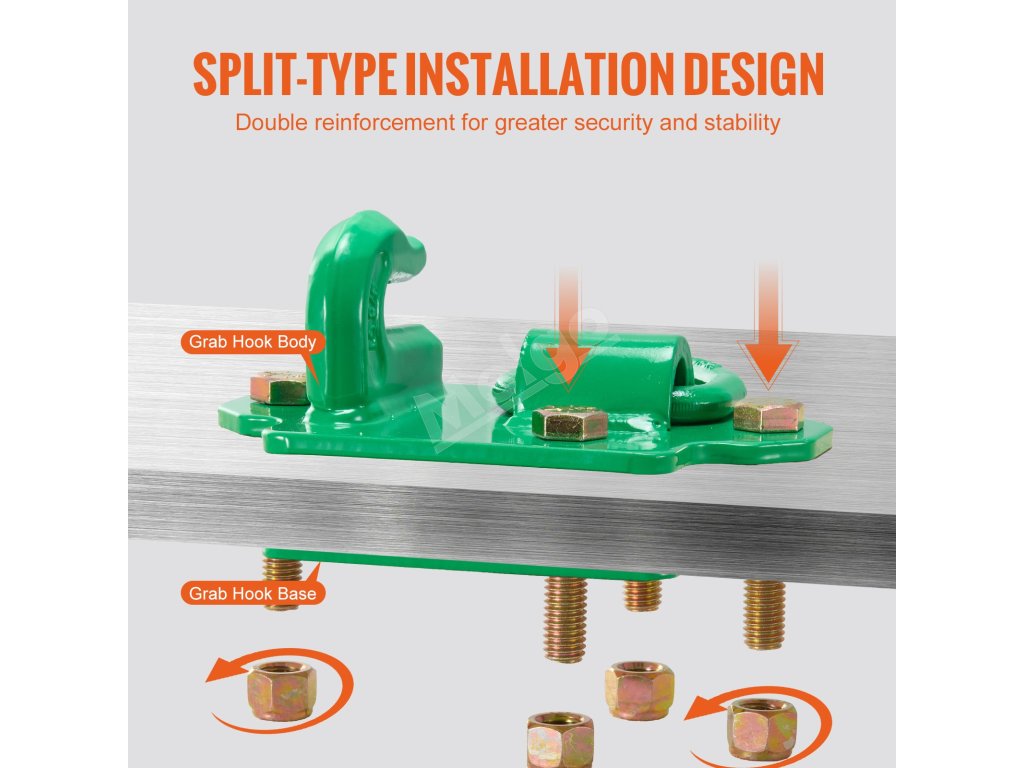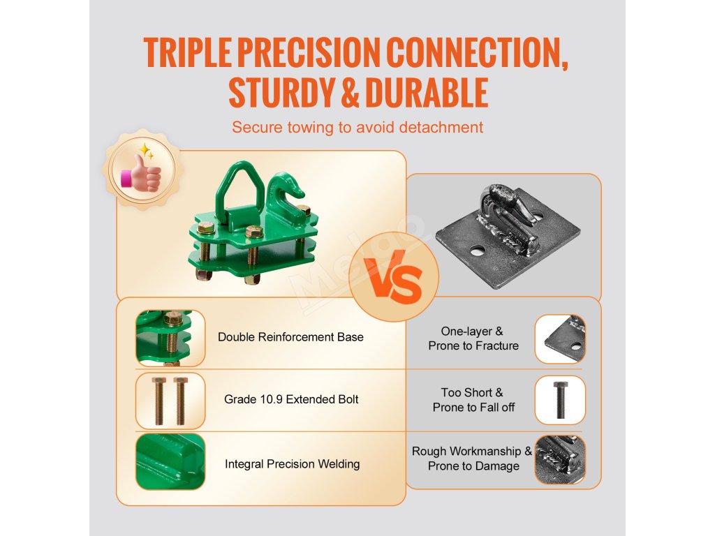Traktorové háky sú vybavené dvojitým systémom upevnenia pomocou skrutiek a zvárania, čo zabezpečuje stabilitu a spoľahlivosť počas ťahania. Jeho zelený práškový povrch zvyšuje ochranu proti korózii a hrdzi, čím zabezpečuje odolnosť v náročných poveternostných podmienkach.