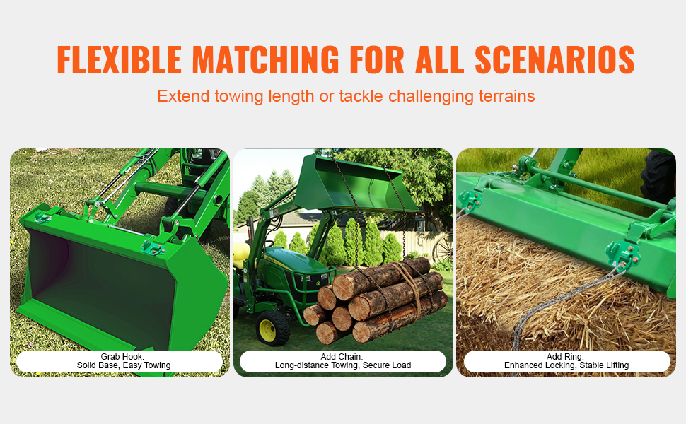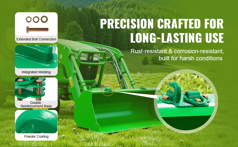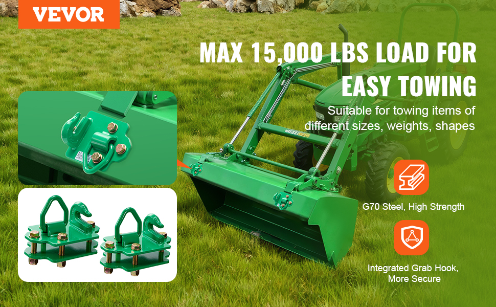 Háky lyžice traktora sú vyrobené z vysokopevnostnej ocele G70 a majú robustnú konštrukciu. Háky s traktorovou lyžicou sa prispôsobujú rôznym veľkostiam a hmotnostiam, pričom ich maximálna nosnosť je 15 001 lbs, čo uľahčuje rýchle plnenie úloh pri ťahaní prívesov.