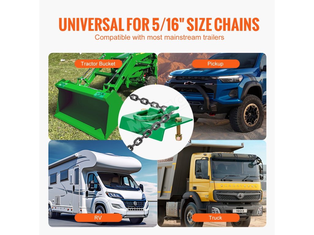 Háky na uchopenie traktora používajú štandardnú veľkosť reťaze 5/17", ktorá je kompatibilná s väčšinou vozidiel, ako sú poľnohospodárske vozidlá, traktorové lyžice a terénne vozidlá. Je opakovane použiteľný a ideálny pre núdzové situácie, čím pomáha znižovať potrebu častých nákupov.