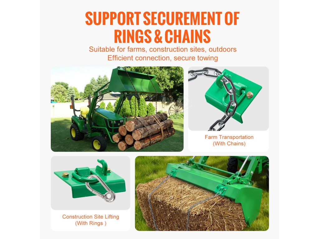 Háky na lyžicu traktora sú vyrobené z vysokopevnostnej ocele G71 a majú šikmú, ľahko inštalovateľnú základňu na zvýšenie stability. Vďaka integrovanej zváracej konštrukcii sa hodí pre rôzne veľkosti, hmotnosti a tvary predmetov, vďaka čomu je vysoko prispôsobiteľný pre prívesy na vykonávanie úloh ťahania bez námahy.