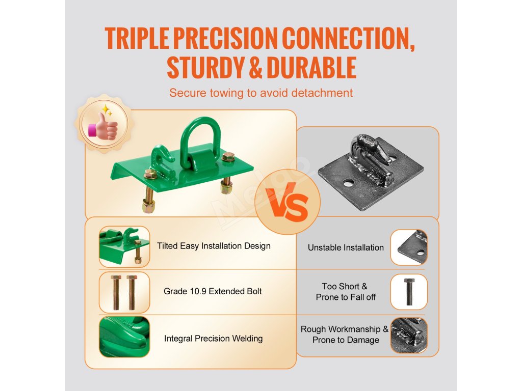 Traktorové háky využívajú dvojitý upevňovací systém skrutiek a zvárania, navrhnutý s ohnutým uhlom na pevné spojenie s prívesom, čo zabezpečuje stabilitu a spoľahlivosť počas ťahania. Jeho zelený práškový povrch zvyšuje ochranu proti korózii, čím sa predlžuje jeho životnosť.