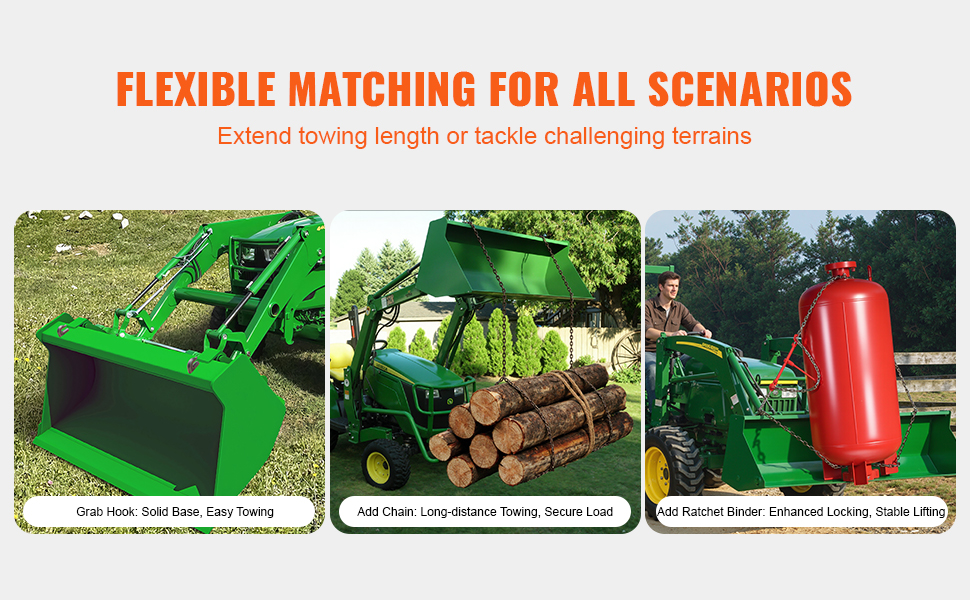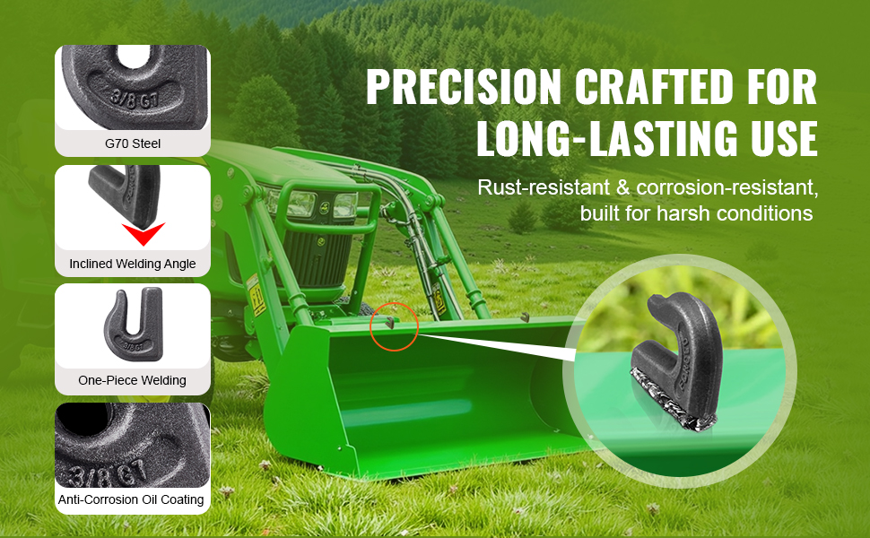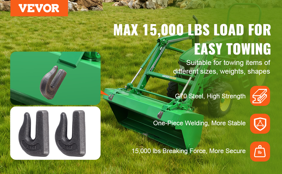 Tento hák na lyžicu traktora je vyrobený z vysokopevnostnej ocele G70 a má robustnú konštrukciu. Je prispôsobený rôznym veľkostiam a hmotnostiam s maximálnou nosnosťou 15 000 lbs, čo uľahčuje ľahké a rýchle vykonávanie úloh pri ťahaní prívesov.