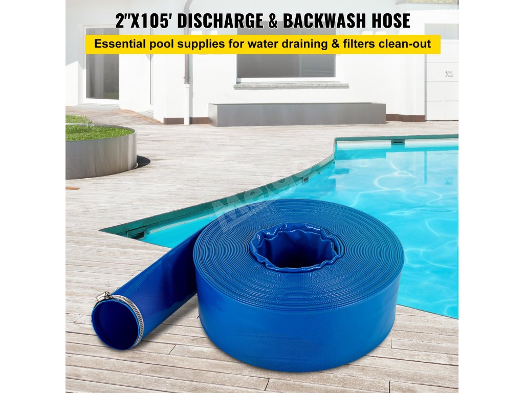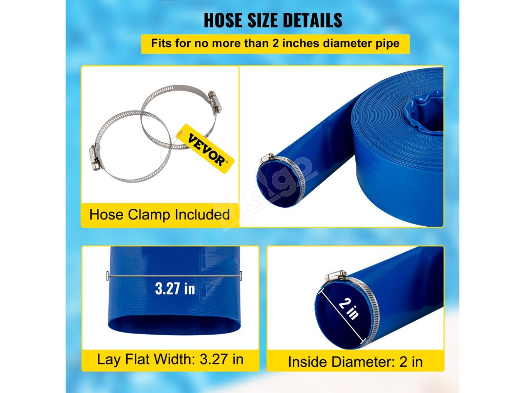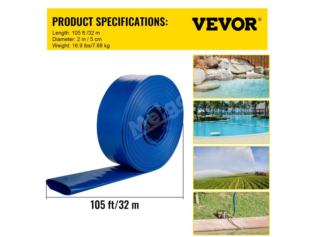 Vypúšťacia hadica je vhodná pre maximálne 2 in potrubia, vnútorný priemer hadice: 2 in/51 mm, plochá šírka: 3,27 in/83 mm, dĺžka: 105 ft/32 m.