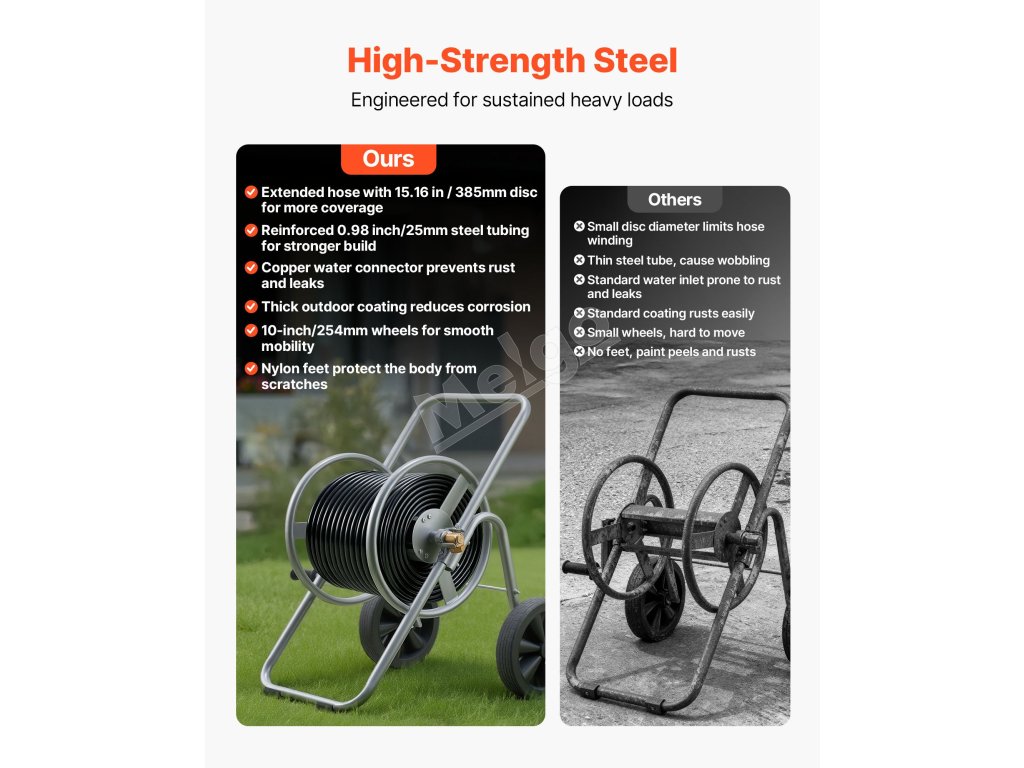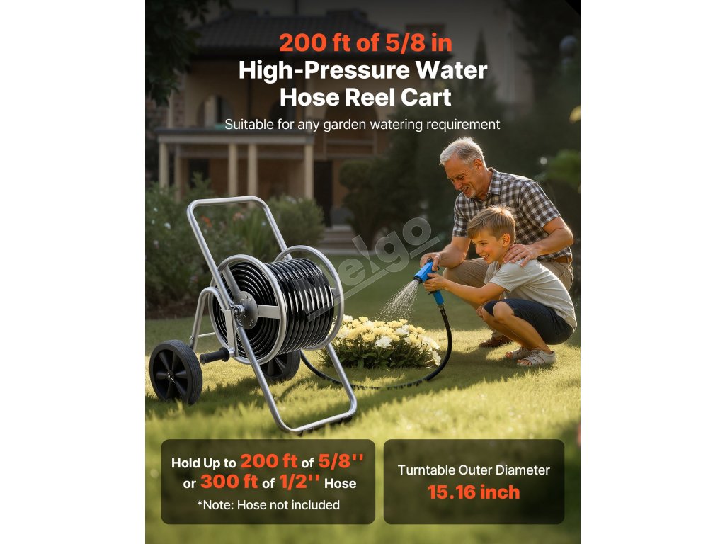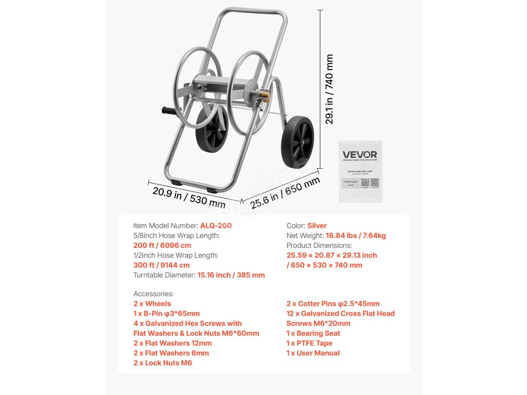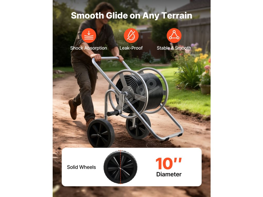 Tento vozík na navíjanie vodnej hadice, vyrobený z ocele Q235A s mosadzným príslušenstvom, pojme 300 stôp (9144 cm) hadice 1/2" (12,7 mm) alebo 200 stôp (6096 cm) hadice 5/8" (15,88 mm). Prevodové navíjanie umožňuje jednoduché navíjanie, zatiaľ čo jeho nízky stred a protišmykové kolieska ho udržia stabilný na tráve, štrku alebo nerovnom teréne.