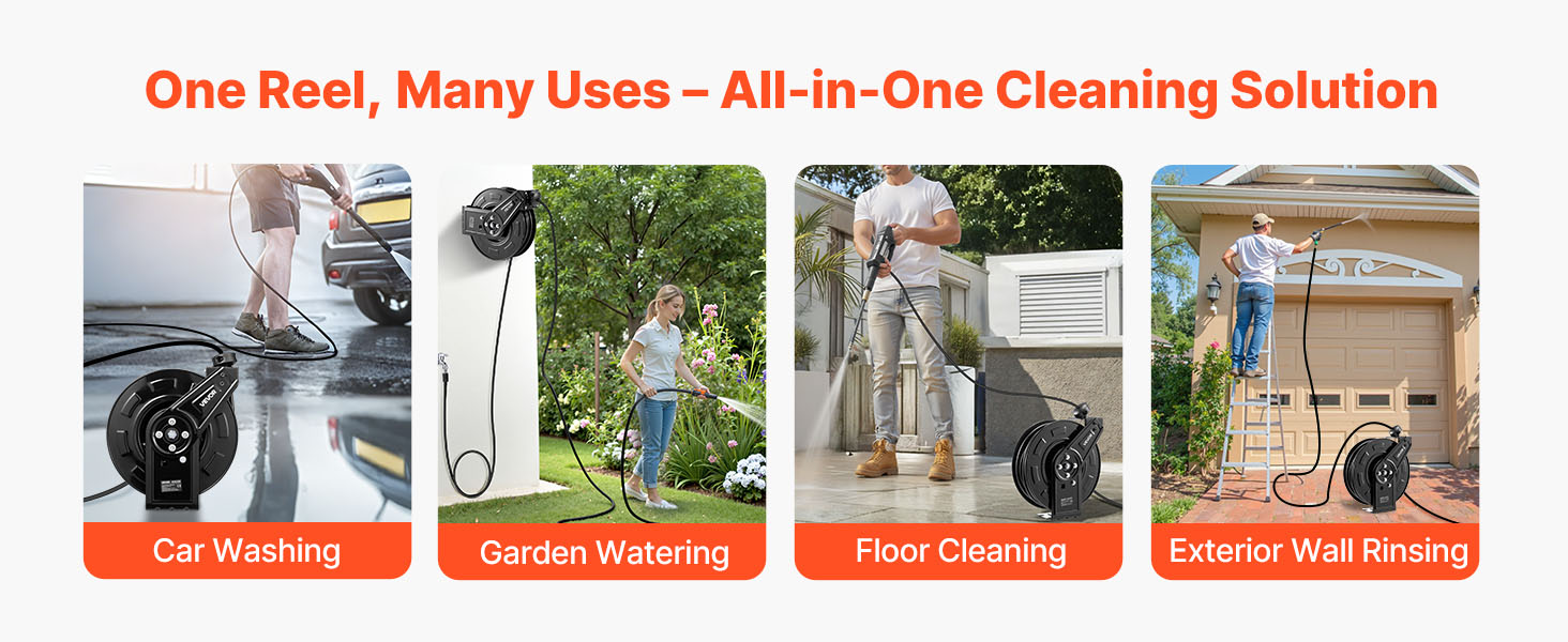 Vhodný na umývanie áut, zavlažovanie záhrady, čistenie podlahy a umývanie vonkajších stien. Komplexné riešenie na ukladanie hadíc pre viaceré úlohy čistenia, ktoré zvyšuje pohodlie.