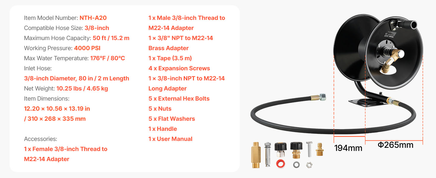 Tento hadicový bubon prehľadne ukladá hadice a zabraňuje ich zamotávaniu. Ideálny pre tlakové umývačky, čistenie automobilov, domáce použitie a zavlažovanie záhrady. Je všestranný a ľahko sa používa, zlepšuje účinnosť čistenia a zavlažovania pri rôznych každodenných úlohách.
